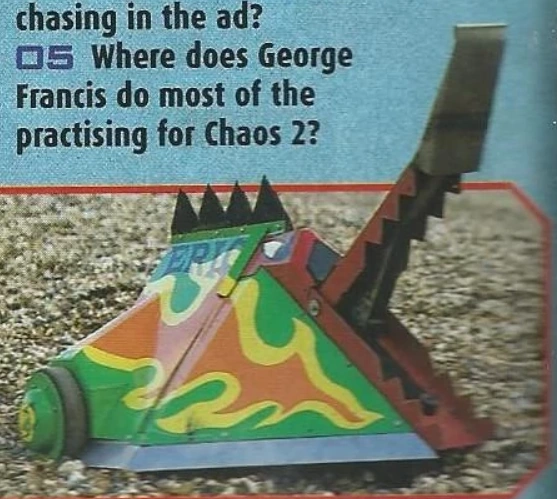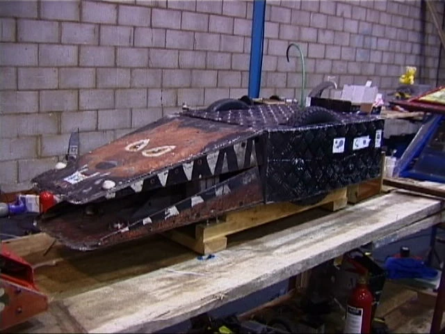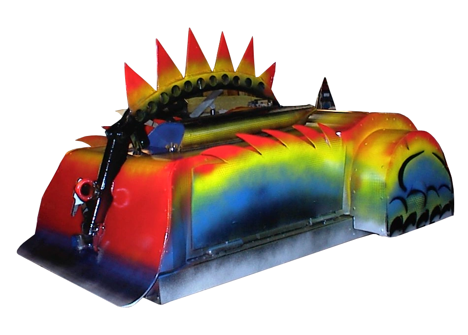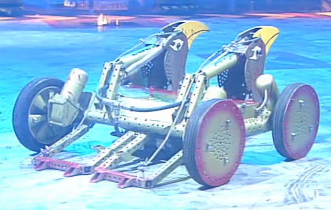 | Red-Green | Gripping | 1997 US Championship | 1997 Featherweight Face-Off Runner-Up and Featherweight Melee Finalist. Pair of symmetrical front jaws operated by a screw mechanism and snowmobile starter motor, capable of lifting and clamping opponents with equal efficiency.[2] | |