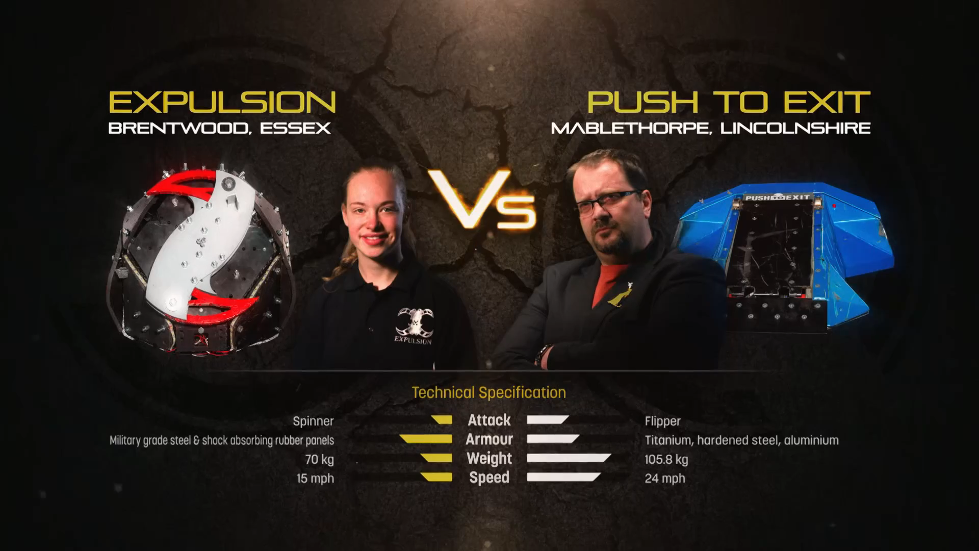Push to Exit began more tentatively than before, driving into Expulsion and pushing them towards Dead Metal. However, Push to Exit was showing signs of intermission. Push to Exit charged into Expulsion again, knocking them away, before turning and taking some damage from Expulsion's spinner head-on. The attack ended up beaching Expulsion on its flipper, but with Push to Exit's weapon showing no signs of life, Expulsion managed to drive off unharmed.