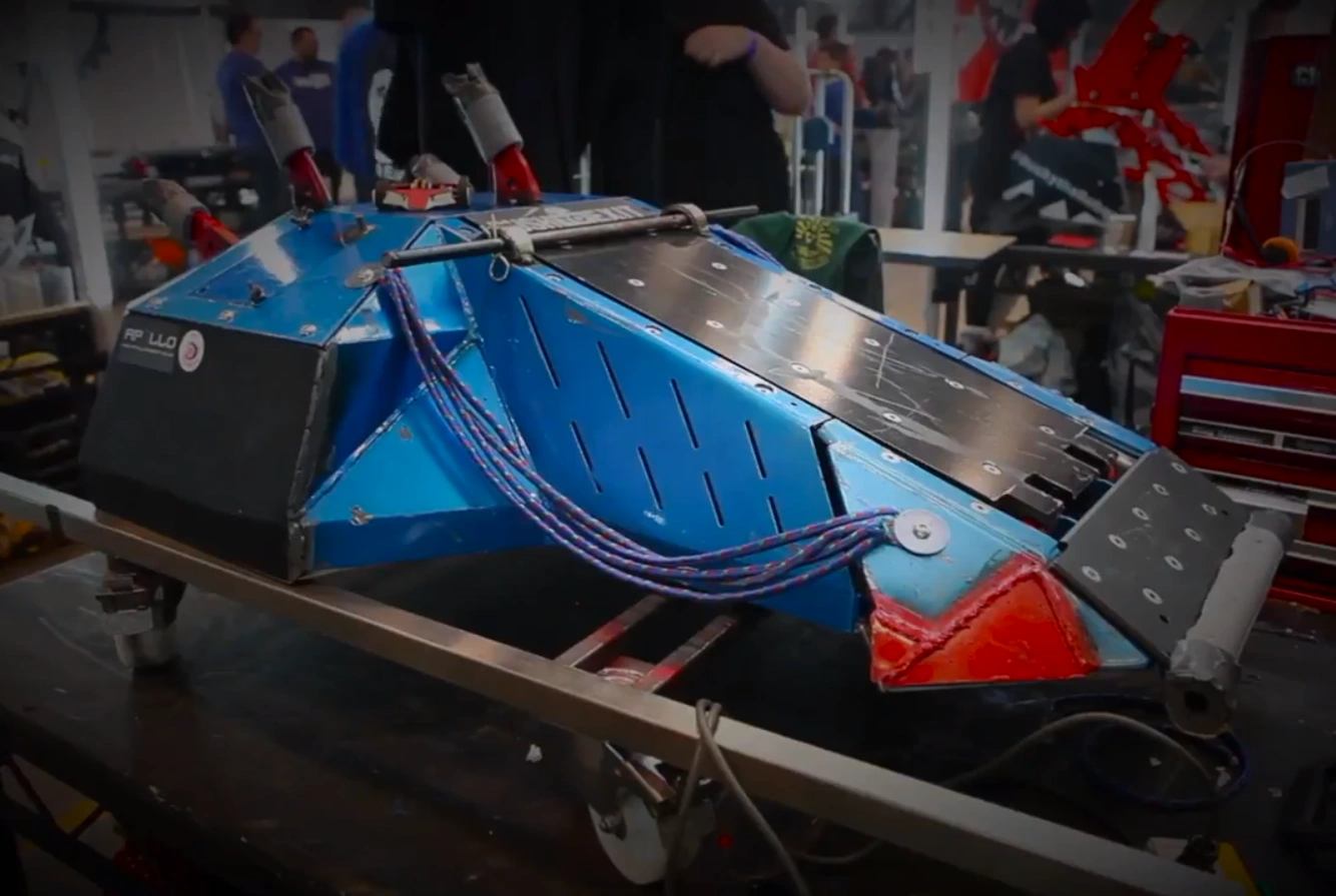 Push to Exit was based on Shane Swan’s most successful live competitor, Envy, using the same setup of motors, Roboteq speed controllers, and drive system. Envy in turn was inspired by Firestorm[1]. Like Envy, Push to Exit was armed with a front-hinged 10-bar flipper, running on low pressure CO2, which also functioned as the robot’s self-righting mechanism. Its armour was mainly comprised from 3-6mm HARDOX, with elements of aluminium and titanium also utilised.