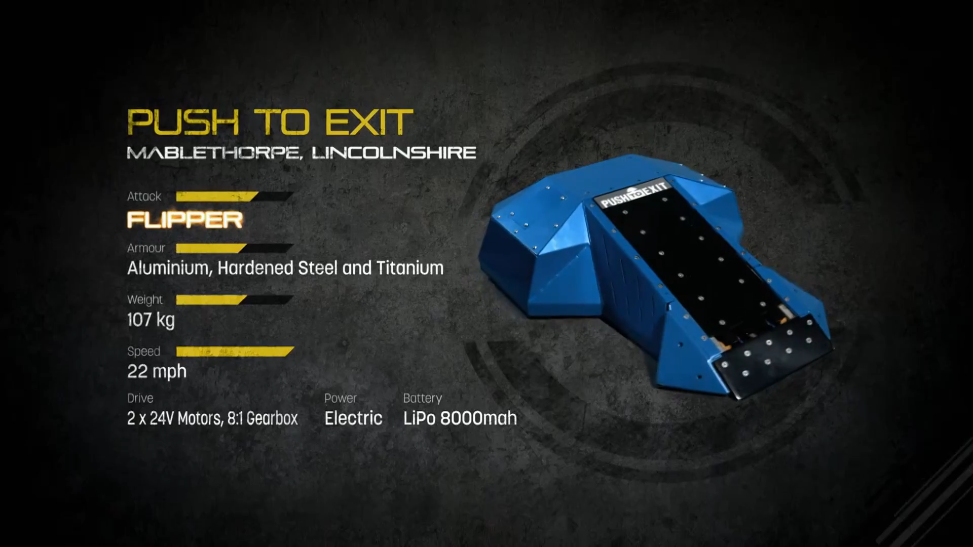 Push to Exit was one of the fastest robots in Series 9 and 10 with a top speed of 24mph, and was also among the shortest, at 250mm in height. However, it had a high ground clearance at the rear, and was immobilised with relative ease, suggesting unreliability. In Series 10, the robot was decorated with red spikes, and ropes could be attached to the robot in an effort to entangle spinning weapons. The spikes were also intended to act as form of entanglement, but it failed to work. Push to Exit also gained a buffer tank to help flip robots, which meant the 28.8V OptiPower lithium polymer batteries needed to be placed in the middle of the machine[2].
