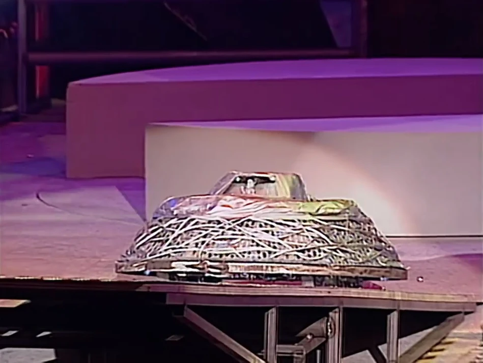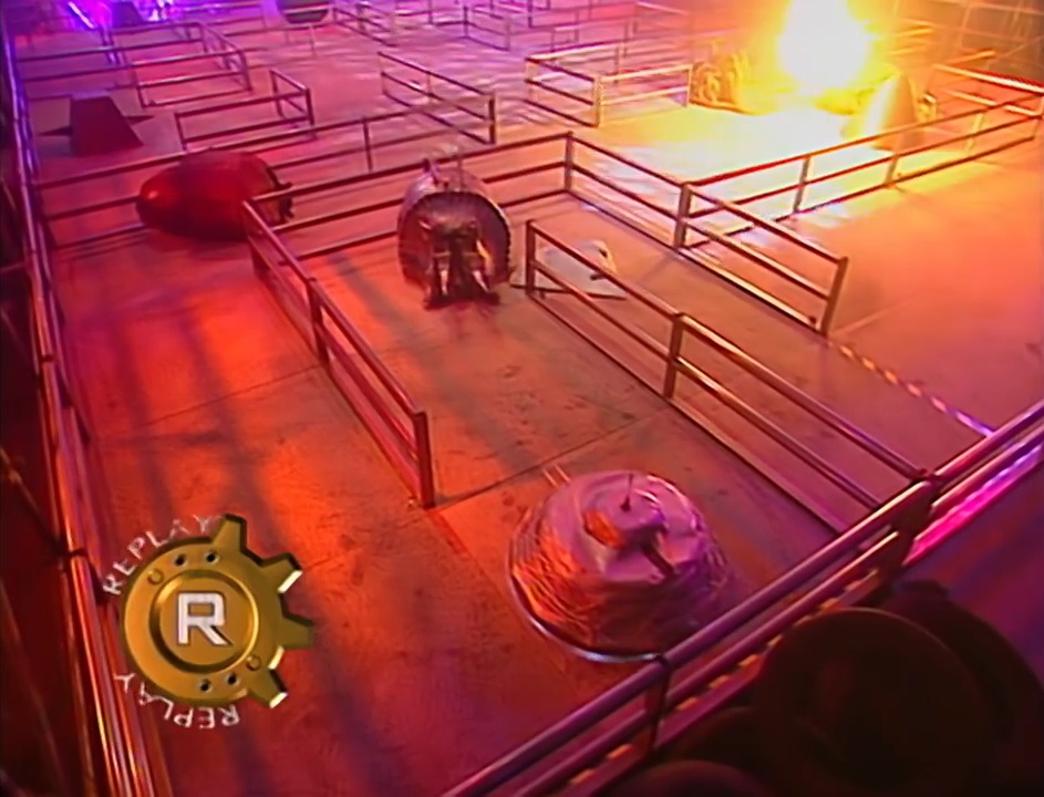 Starting the faster of the two competitors, it weaved precariously close to the left grille during its initial approach on Bodyhammer. A tentative driving match followed, where REALI-T momentarily succeeded in spiking Bodyhammer following its run-in with Dead Metal. Collisions with a spiked pyramid and an errant Matilda followed, the latter leaving REALI-T vulnerable as Bodyhammer began pushing it around from the side, into another pyramid in the lower-left CPZ. REALI-T tried to escape, only to be collected and momentarily pressed against the railings by a returning Matilda. When Matilda left to patrol her zone boundary, REALI-T eventually backed out. It soon turned into the spiked pendulum and a waiting Dead Metal, just as Bodyhammer beached itself on the left grille during its own dice with Sergeant Bash.