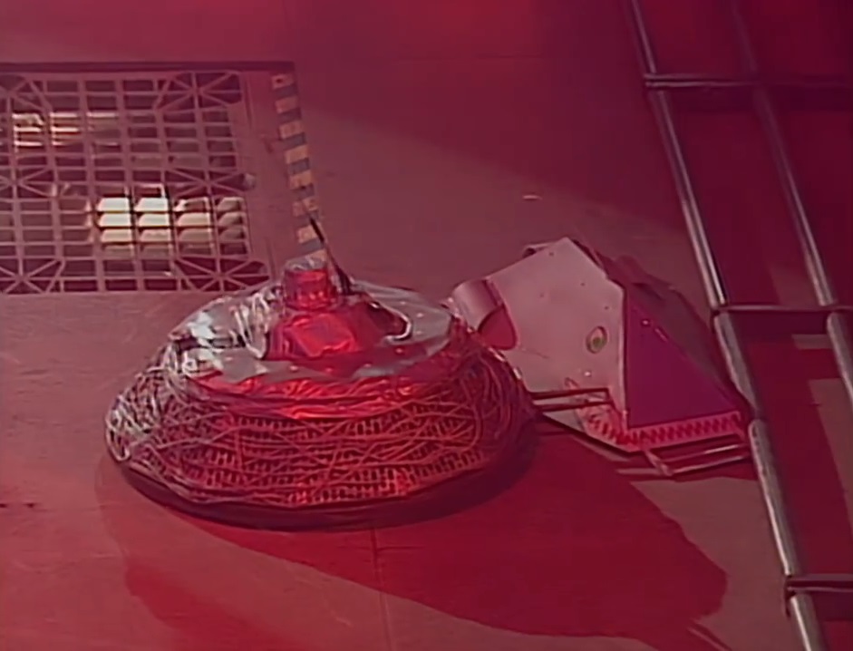 A tentative start saw both competitors ram each other head-on multiple times. Though Full Metal Anorak tried to get underneath it with its front blade, REALI-T kept pressuring it towards the lower perimeter, within reach of the swinging pendulum. It continued to follow an increasingly evasive Full Metal Anorak around, only to be blocked by Sergeant Bash as he left his CPZ to attack both competitors.