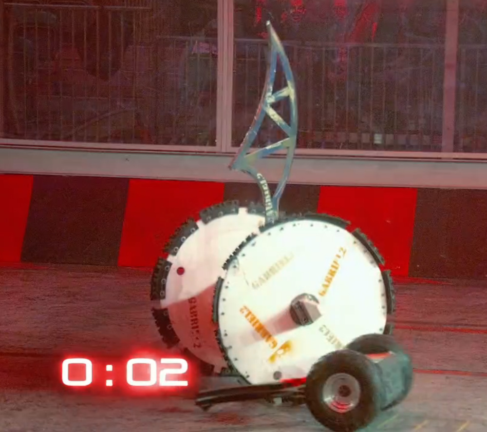 Rabid M8 spun on the spot again, knocking Gabriel 2 aside, also tricking it into driving over the floor flipper. Carefully avoiding the same hazard, Rabid M8 backed into Gabriel 2, but was struck from above afterwards, leaving both robots to swing their maces in synchronicity. Rabid M8 continued to spin in place until it pressed the Arena Tyre, activating Rogue House Robot. This worked favourably for Rabid M8, as Shunt barged Gabriel 2 into the corner of the arena, bending its wheels using force and axe blows. As Gabriel 2 now had only one working wheel, Rabid M8 was in an advantageous position, and it struck the side of Gabriel 2's wheel. In the last five seconds, Gabriel 2 became completely immobile, and Rabid M8 drove into it before 'cease' was called. As Gabriel 2 had become immobile so late into the match, the battle proceeded to a Judges' decision.