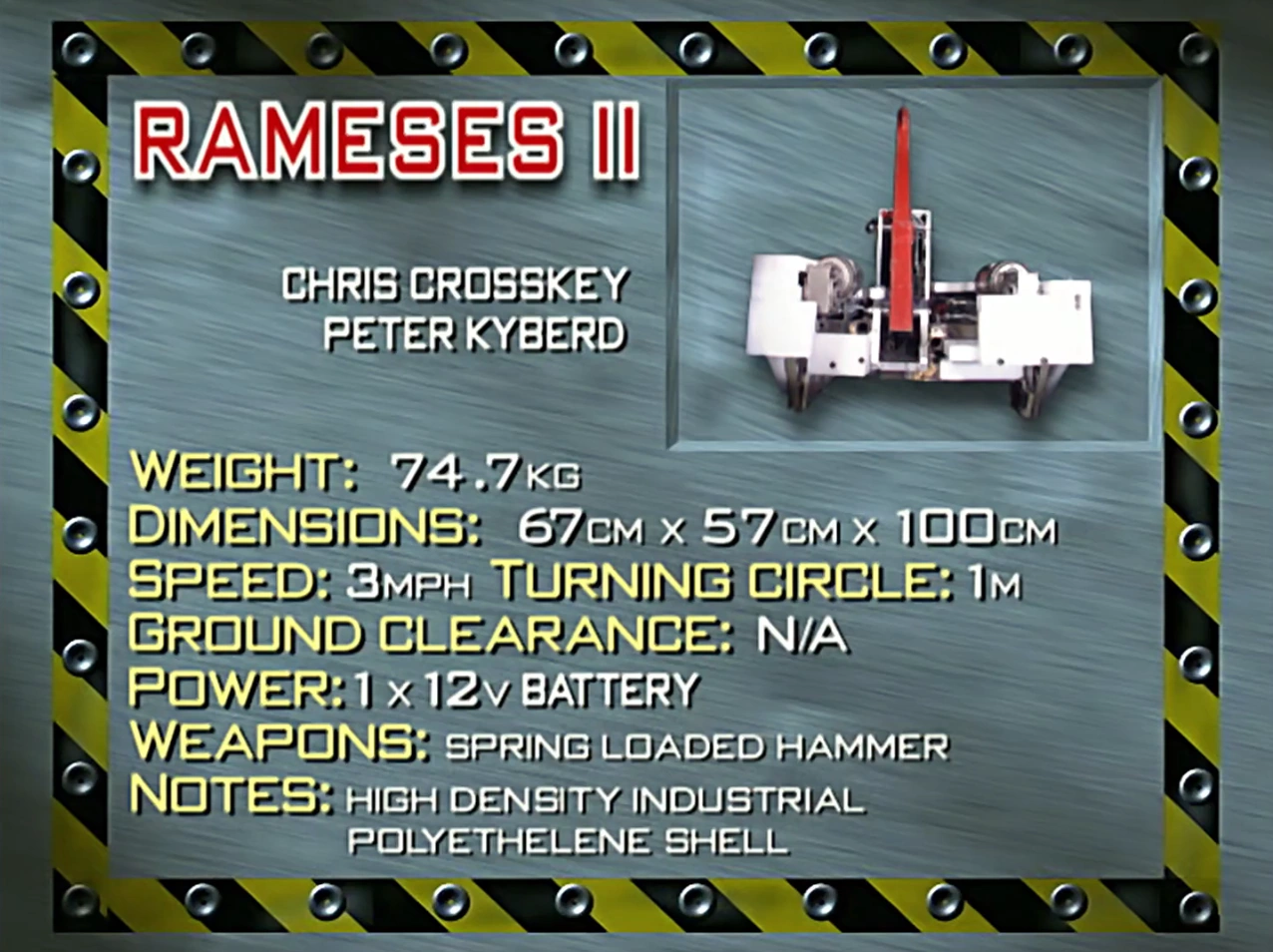 - "The team that brought us Skarab last time around walk like Egyptians again! Rameses the Second, with an unusual high-density industrial polyethelene shell which could clog up chainsaws. And then there's always that spring-loaded arm, to bring the opposition a winter of discontent!"