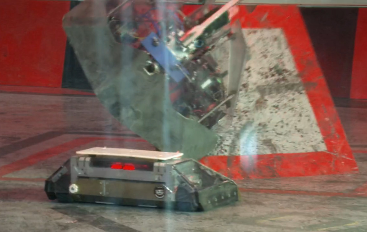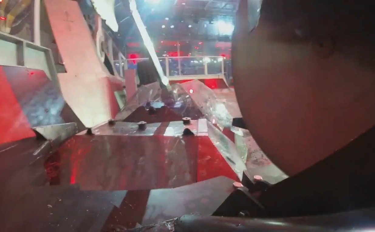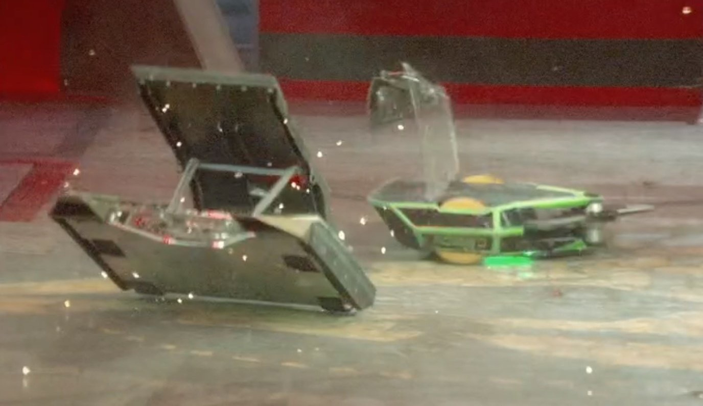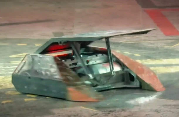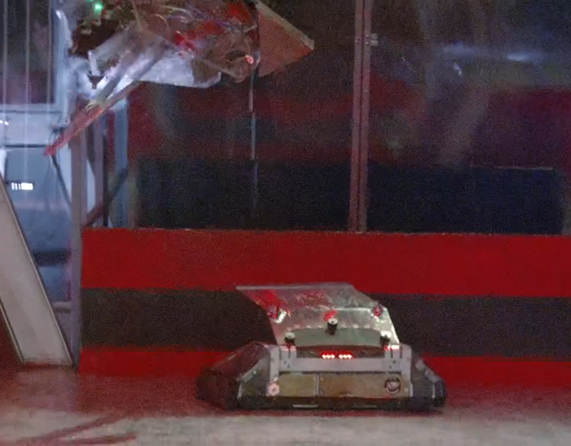 Moments after the battle begun, Rapid headed straight for the Arena Tyre, which activated Fog of War. Rapid also pushed Bucky the Robot into Matilda during this period. As Fog of War was ending, Rapid was briefly caught by the Arena Spikes, but more pertinently the hazard also overturned Track-tion, leaving it vulnerable near the arena wall. Rapid capitalised by throwing Track-tion high over the arena wall and into the trench with its first flip, leaving Rapid to fight Bucky the Robot alone.