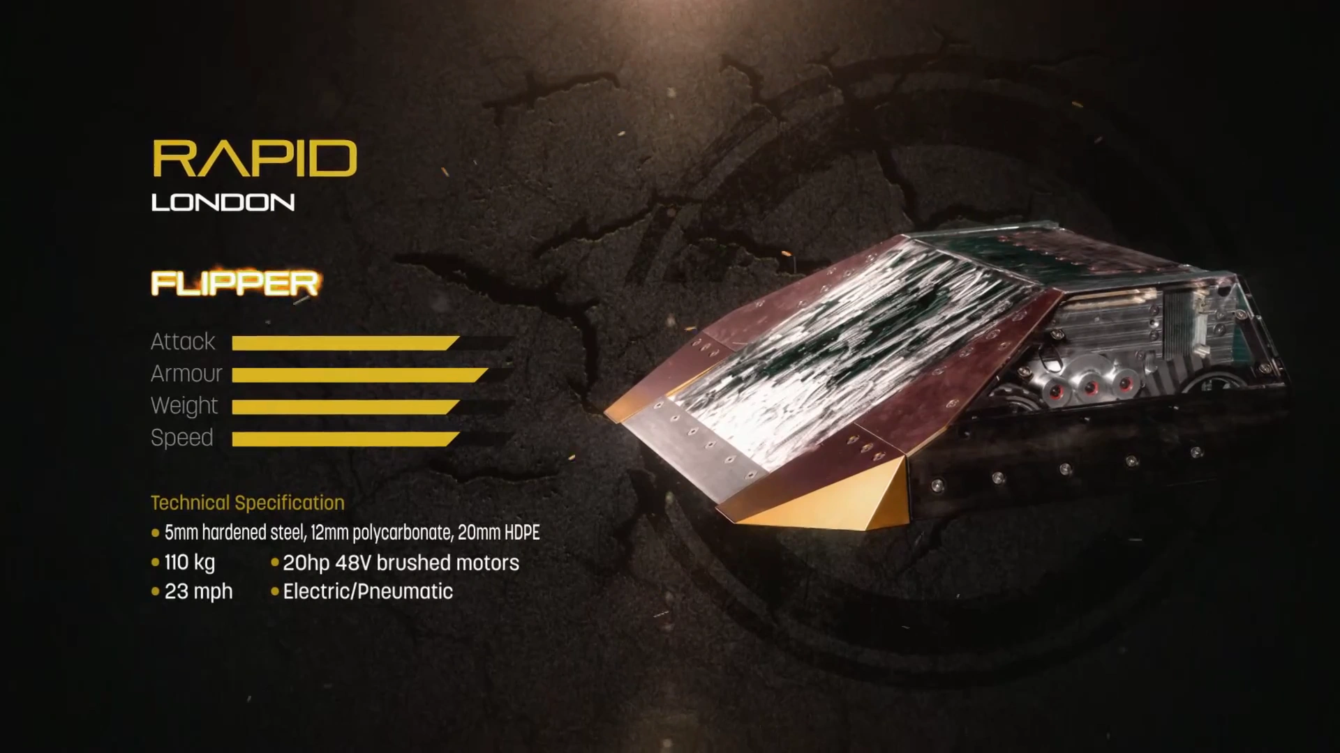 - "Rapid was a brand new competitor for Series 9 and stood out with its low profile and chrome paint. It has a flipper capable of lifting seven tonnes, five times more powerful than opponents, and cost £25,000 to build."