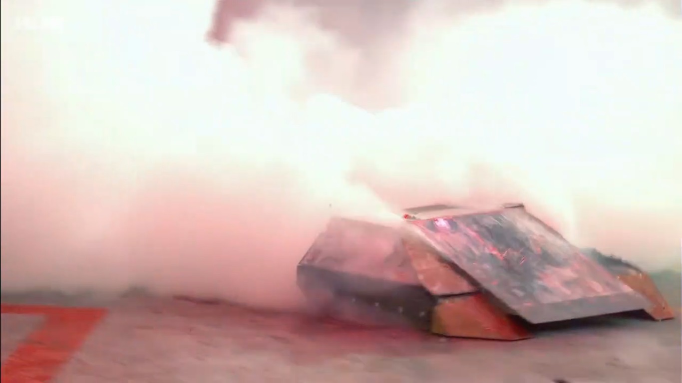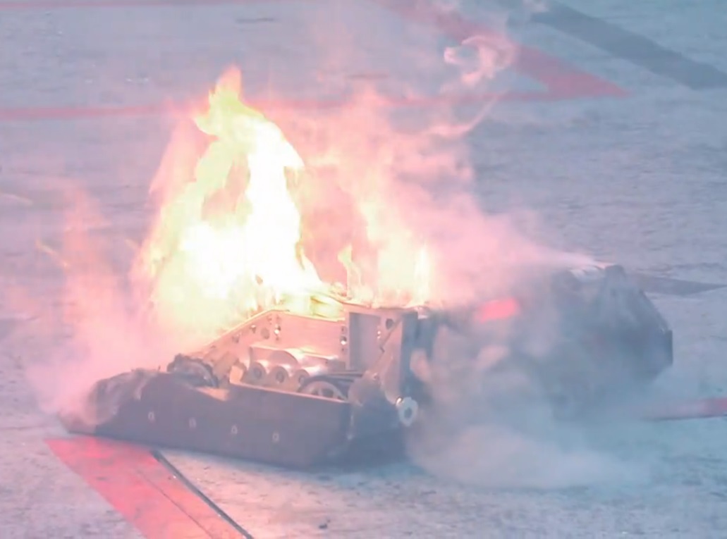 Some time after 'cease' was called, Rapid burst into flames completely, enveloping the whole robot in fire to the amusement of both teams. The charred remains of Rapid were therefore eliminated from the competition - nevertheless, Team RPD were satisfied with their dramatic exit from the competition.