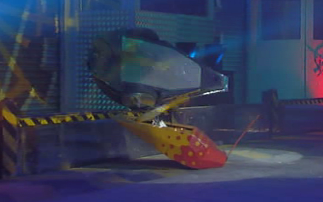 Both halves of Gemini chased Reactor 2, which drove into Shunt, but as the two halves got close, Reactor 2 hit one of them with its axe, so that half turned away, and when the other half got close enough to flip, Reactor 2 reversed. That half of Gemini turned away, and Reactor 2 drove by the flame pit. As Reactor 2 turned around, one half of Gemini drove behind it and tried to flip, but Reactor 2 turned, causing it to miss with the flipper. The other half of Gemini drove at Reactor 2, trying to get underneath, and managed to lift Reactor 2 up and lift it onto the flame pit, holding it there for a time, before dropping it. The other half of Gemini tried to flip Reactor 2, but could only lift it a little, and Reactor 2 turned off the flame pit. Reactor 2 drove to the arena centre and turned around, and one half of Gemini drove at it, tried to get the flipper under the side, but Reactor 2 turned and reversed, causing it to miss. That half of Gemini drove back at Reactor, trying to get under the front, but instead got under the flipper plate.