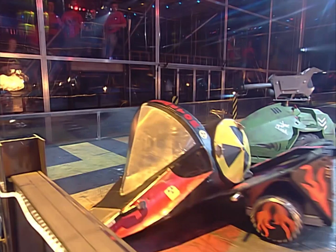 As Matilda and Sgt. Bash came in to attack Scorpion, the front of Reactor seemed to be stuck under an arena spike, but Reactor managed to reverse. As it did so, Matilda blocked it, but Reactor managed to push past her. This meant Reactor was through to the next round of the heat along with the seeded Sir Chromalot.
