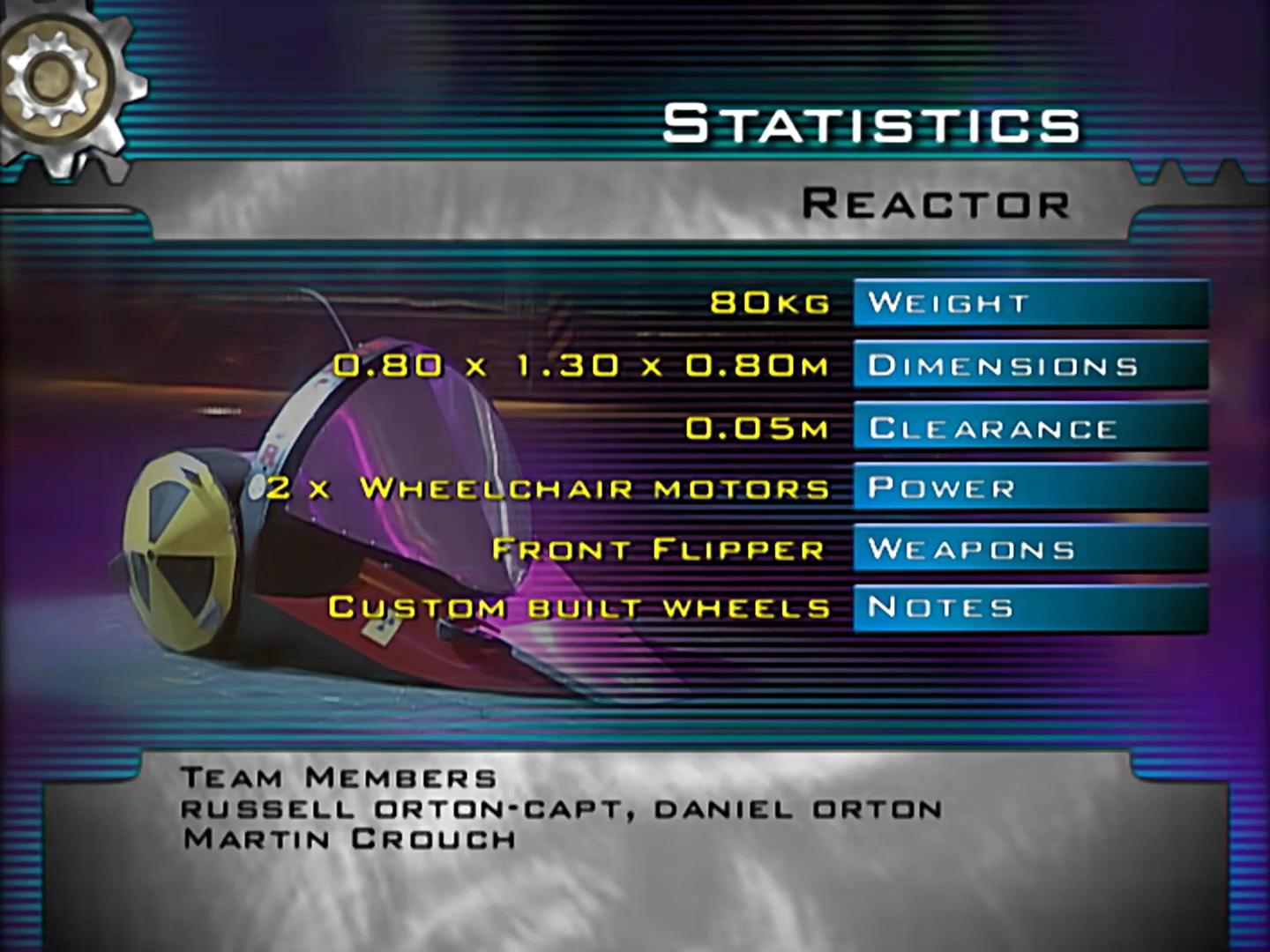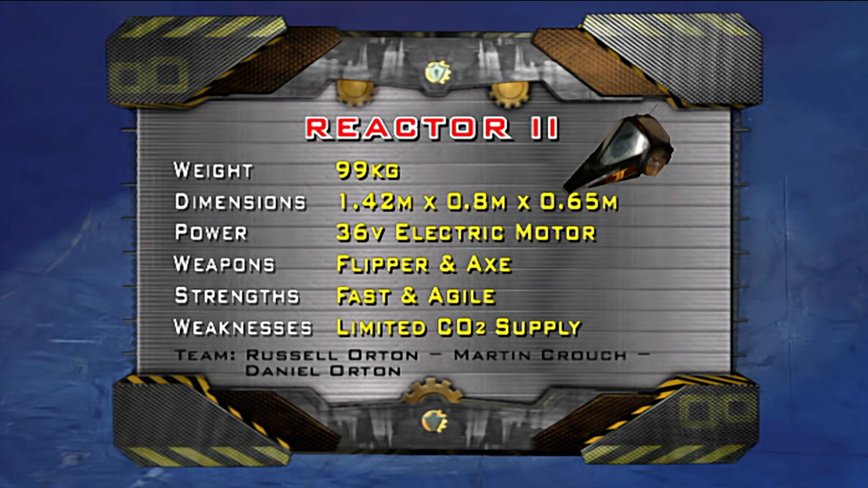 Reactor was entered into Robot Wars by a team from Birstall in Leicestershire, known simply as Team Reactor. The team was captained by joiner-by-trade Russell Orton, and he was joined by his son Daniel who made the first prototype of the machine out of a toy construction kit. Martin Crouch also completed the team to assist with engineering, and was the weapons operator. The team also competed in Series 7 with Rhino.
