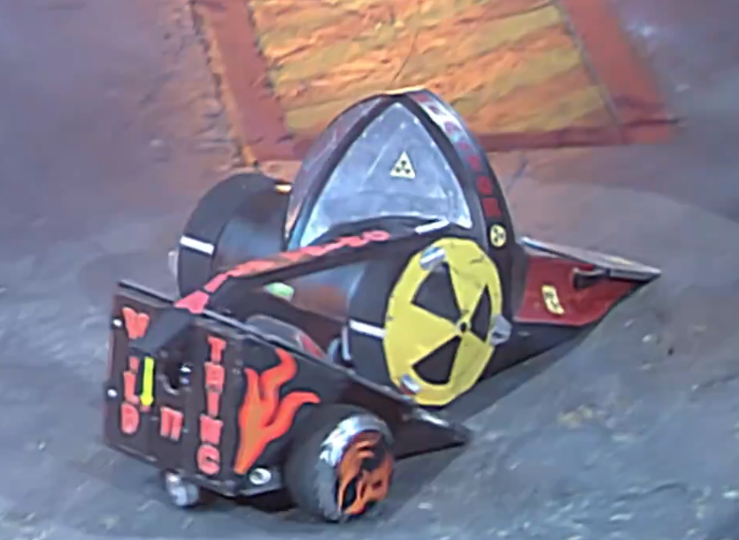 Wild Thing started the quicker, charging at Reactor's side, and got underneath with the wedge. As Wild Thing pushed it, it raised its lifting arm to hold Reactor still, until Reactor's lifter at the front dug into the arena floor. Wild Thing reversed, lowering its lifting arm, then got behind Reactor, getting under it again and pushing it to a flame jet on the top arena wall.