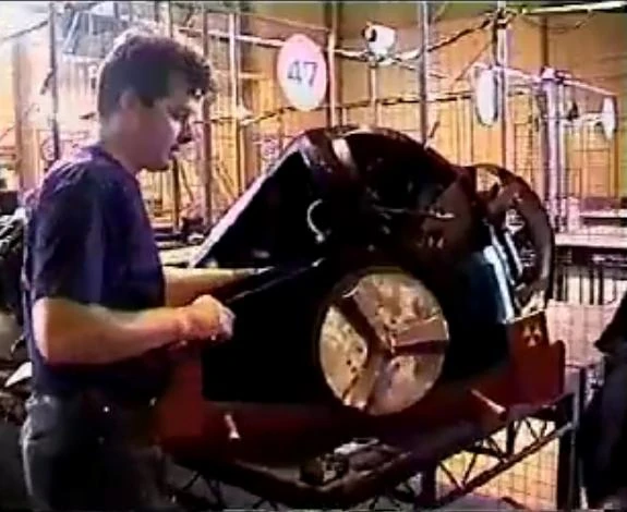 Sir Killalot grabbed Reactor by one of the wooden wheels, crumpling the side, Wild Thing continued pressurizing, shoving Reactor into Sir Killalot's claw, which crumpled the wooden wheel. Reactor spun its wheels, trying to retreat away, but it didn't get enough traction, and Sir Killalot held it in place. Dead Metal then came in on Reactor, but went away after Killalot let it go. Reactor sluggishly reversed away, drove into the centre of the arena, where Wild Thing was waiting for it. Wild Thing charged at Reactor, but failed to get underneath, so drove past and turned around for anther attack.