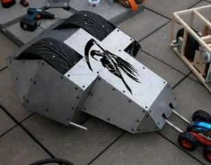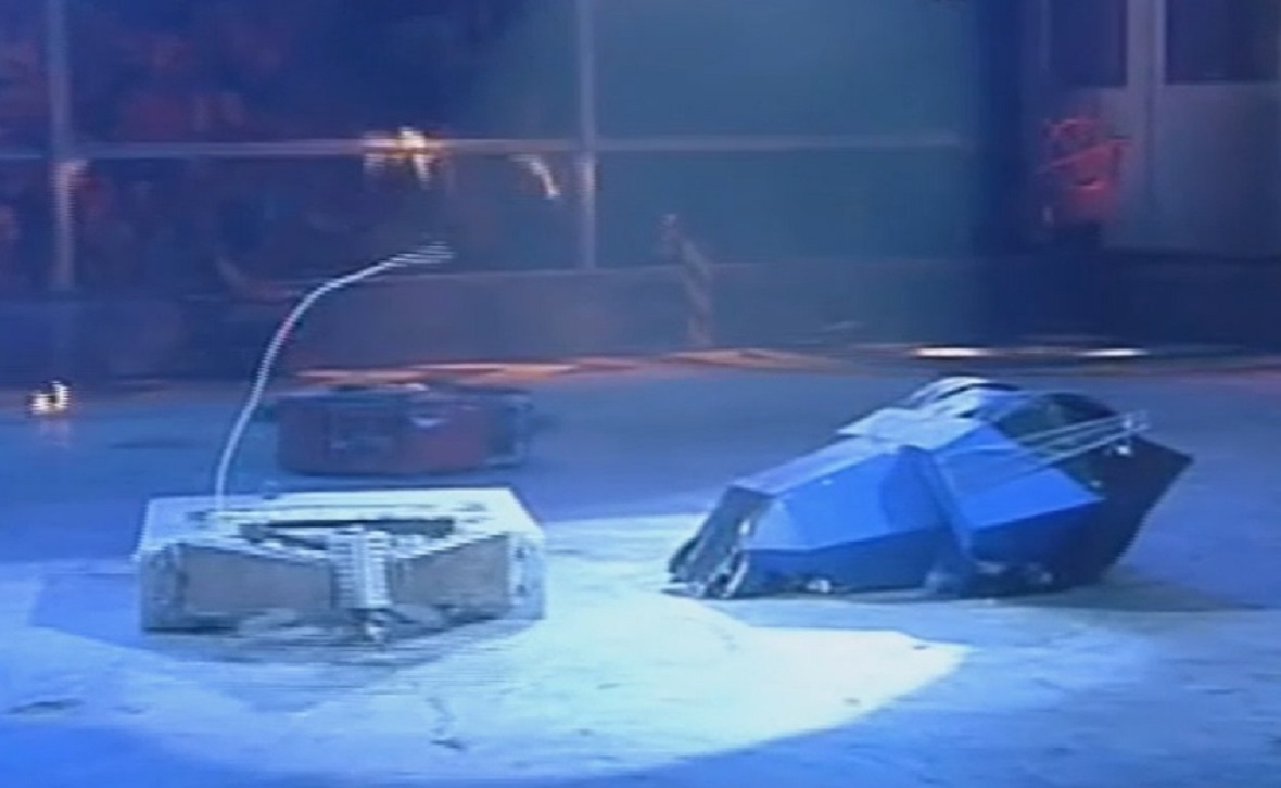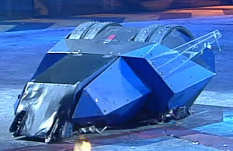 - "Part wedge-form robot, invertible, has large tyres, plenty of traction, can lift up to one hundred and fifty kilos, thin armour though and the weaponry is slow."