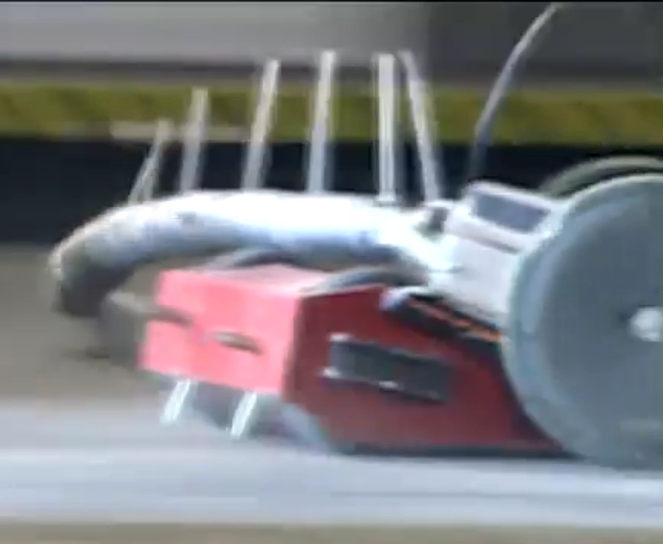 However, Red 2 would also become entangled itself, as the duo was surrounded by all three segments of Triple Redundancy. Having fallen foul of the clusterbot's tactics, it was lifted from the left-hand side by Arsenic's scoop, but landed upright. In retaliation for Triple Redundancy's successful entanglement, Red 2 next tried to push the former's smallest segment in the far side of the arena. Red 2, Triple Redundancy and Spiny Norman all converged once again, crawling back and fourth across the arena perimeter. All five machines were soon caught in a literal stalemate, with Red 2 playing no further part in the Melee. As such, it was ultimately deemed to have been immobilized, with Slomo 3 emerging as the winner and sole finalist from this battle. Red 2 was eliminated from the Featherweight Melee tournament at this point.[21]