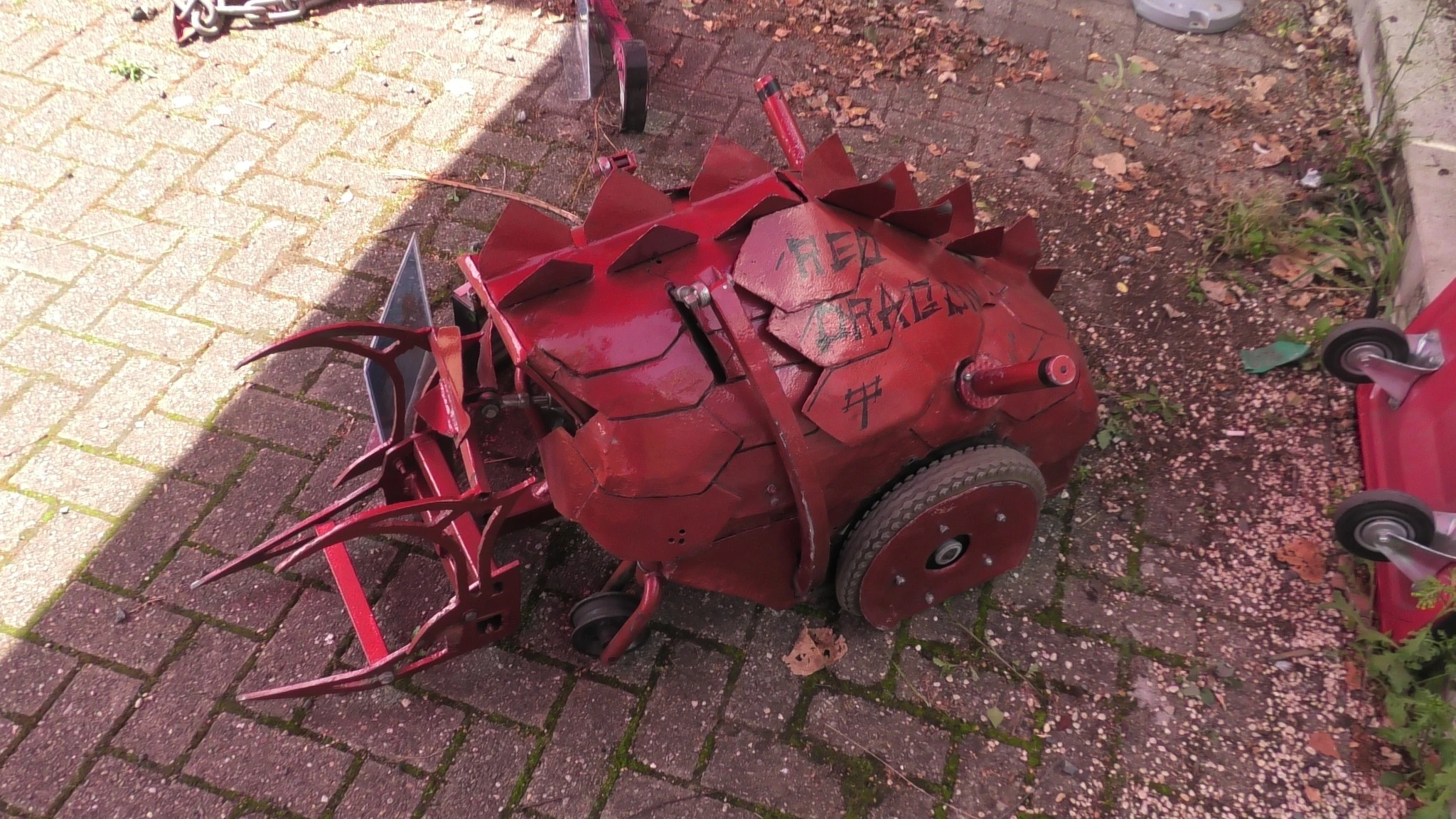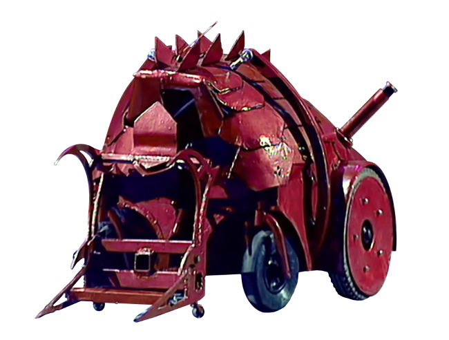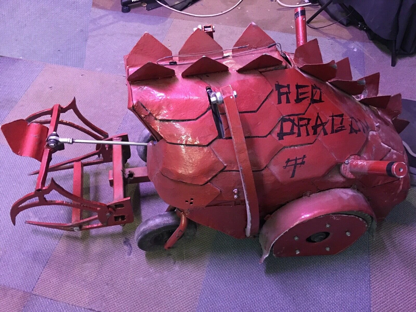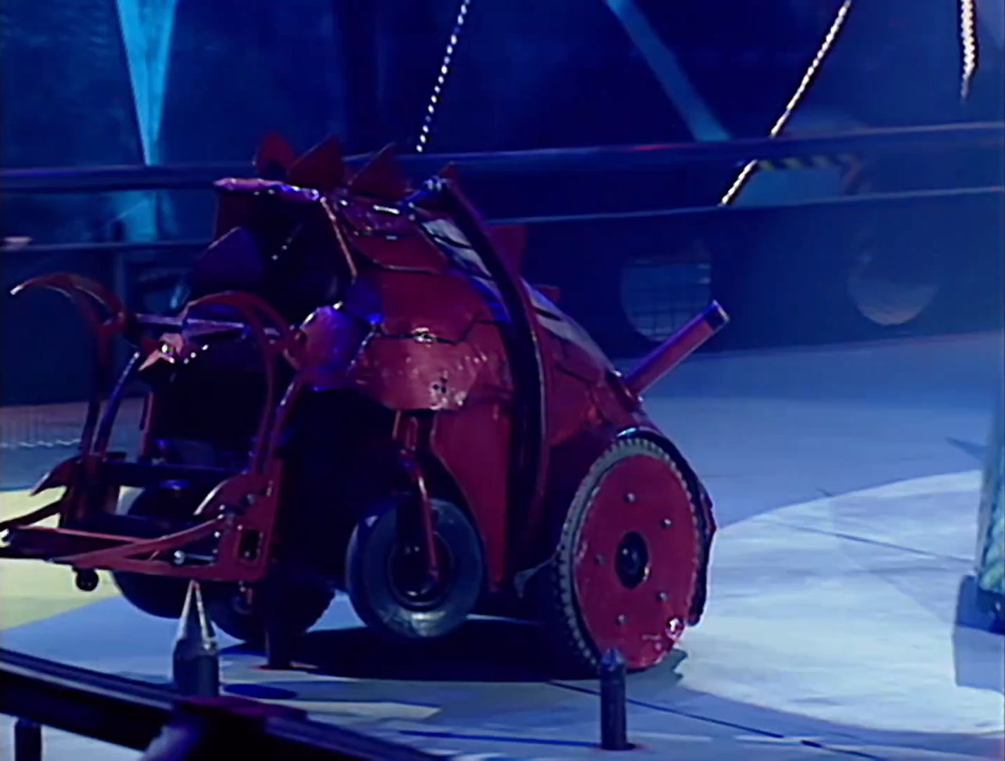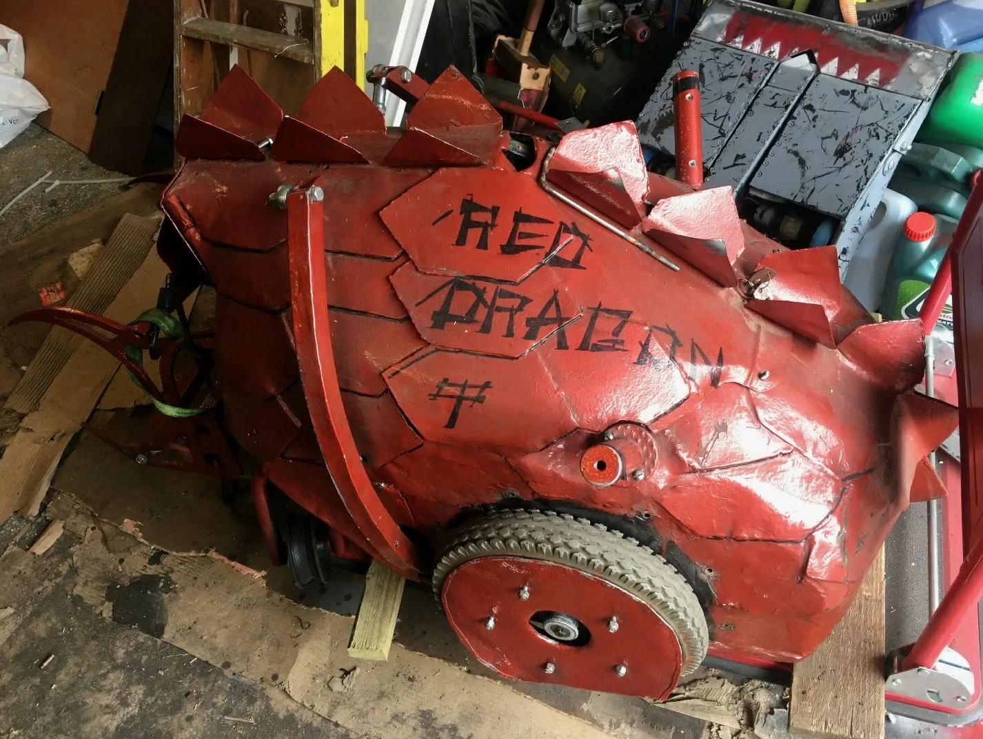 Red Dragon was an unusually shaped robot that resembled a dragon. Its steel shell - described as "scales" - was scavenged from a local scrapyard. In terms of weaponry, Red Dragon featured a hybrid of pneumatic claws - which were powered by a CO2 cylinder - and a lifter. Each side of the robot also featured a self-righting mechanism powered by a linear actuator, still a relatively new concept at the time of Series 3. Red Dragon was primarily driven by two large tyres, and also featured additional castor wheels at the front.