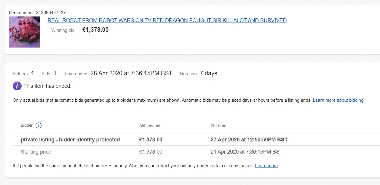 In July 2023, Red Dragon resurfaced in another eBay auction, this time at a lower starting bid of £1,000 with Tom Armstrong providing photographs of the robot's internals. Once again, the robot was not sold despite its subsequent relistings offering lower prices. In November, Red Dragon was finally sold for £500.