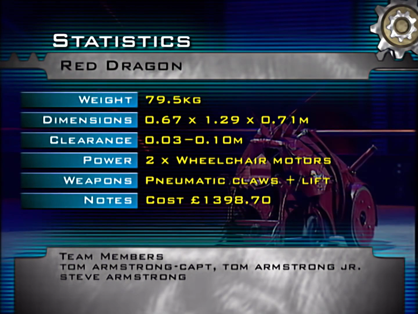 Red Dragon was built by a Sunderland-based team made up of the Armstrong family. Guitar shop owner Tom Armstrong captained the team and drove Red Dragon, and he was joined by his son Tom Armstrong Jr.. Another team member, Steve Armstrong, was listed on the statistics board, but he was absent during filming. The team were the only representatives of Tyne and Wear in the original run of Robot Wars, with even the reboot having double the representatives via TR2 and Vulture.
