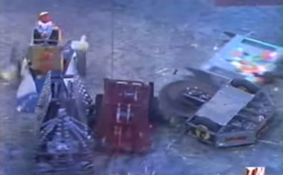 Together, Conquering Clown and Red Virus pushed Drillzilla, until Drillzilla turned, and managed to push Conquering Clown down towards a CPZ. Red Virus followed Drillzilla, and as Conquering Clown turned away, Red Virus got behind Drillzilla, but Drillzilla turned around to face Red Virus, so Red Virus reversed, accidentally backing into an angle grinder. Drillzilla drove at Conquering Clown, and Rippa Raptor drove down the arena, then got at Rippa Raptor's side and pushed it into the front of Conquering Clown. Drillzilla rammed into the back of Rippa Raptor, and Red Virus pushed Rippa Raptor up the arena. Red Virus pushed Rippa Raptor by the floor flipper, but Conquering Clown got beside Red Virus and pushed it away from Rippa Raptor. Red Virus reversed away from Red Virus, and Drillzilla got behind Conquering Clown and pushed it down the arena. Red Virus drove at Rippa Raptor's side and tried to attack, but Rippa Raptor turned and drove away.