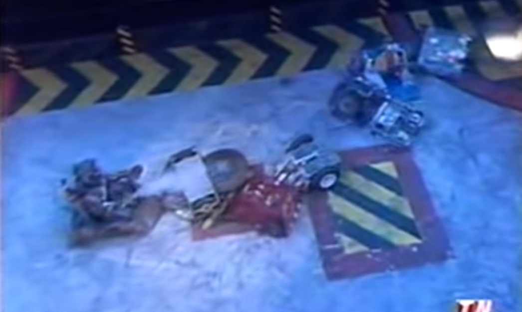Refbot reversed, and pushed against Unibite's side, pushing it free of Red Virus' lifter. Red Virus drove to the arena centre, and with its lifter raised, pushing against Conquering Clown, but Drillzilla got at Red Virus' side and tried to push, so Red Virus turned and drove away. Meanwhile, Skullmania's tyre's had come loose from the wheels, leaving it immobile, and it was counted out by Refbot, leaving Red Virus and the other four to go through.