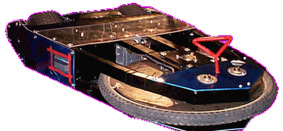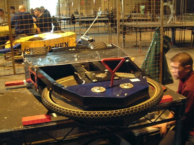 Retribution was an invertible, two-wheeled robot painted dark blue and armed with a large horizontal spinning disc. The disc was made from steel, as was its rear armour (5mm thick according to the Team 13 Black website[1]), and the weapon's outer rim was covered by a bicycle tyre when the robot was stationed outside the arena.