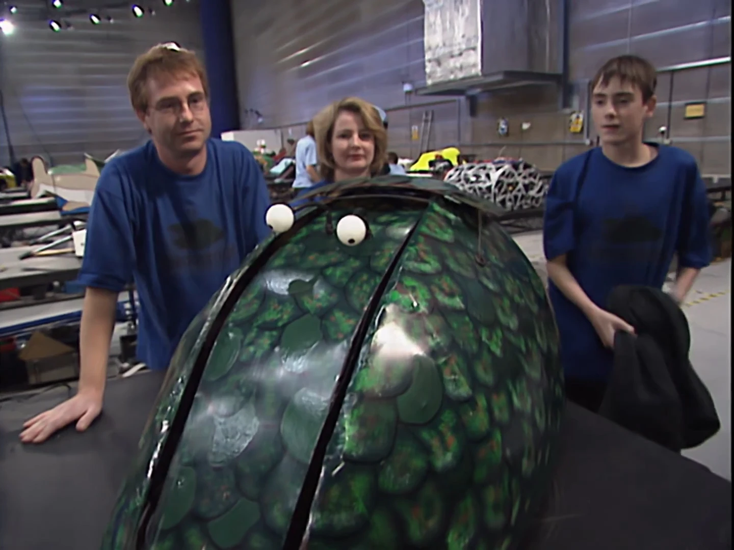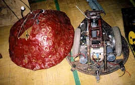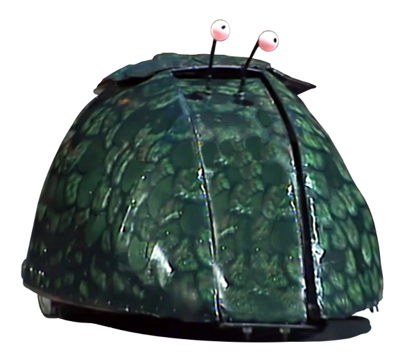 Robogeddon was a tall dome-shaped robot with a green scaly Kevlar/aluminium shell over a steel frame. Its ground clearance was 10cm and it had a zero turning circle. Internally it was powered by a pair of wheelchair motors. Its weapon was a lifting ram capable of hoisting a grown man. Overall, the machine took six months to build. The lifter was a reasonable weapon for Series 3 standards, but lacked a prominent lip to wedge under robots and maintain a purchase, and its thin armour was famously exploited by Hypno-Disc.