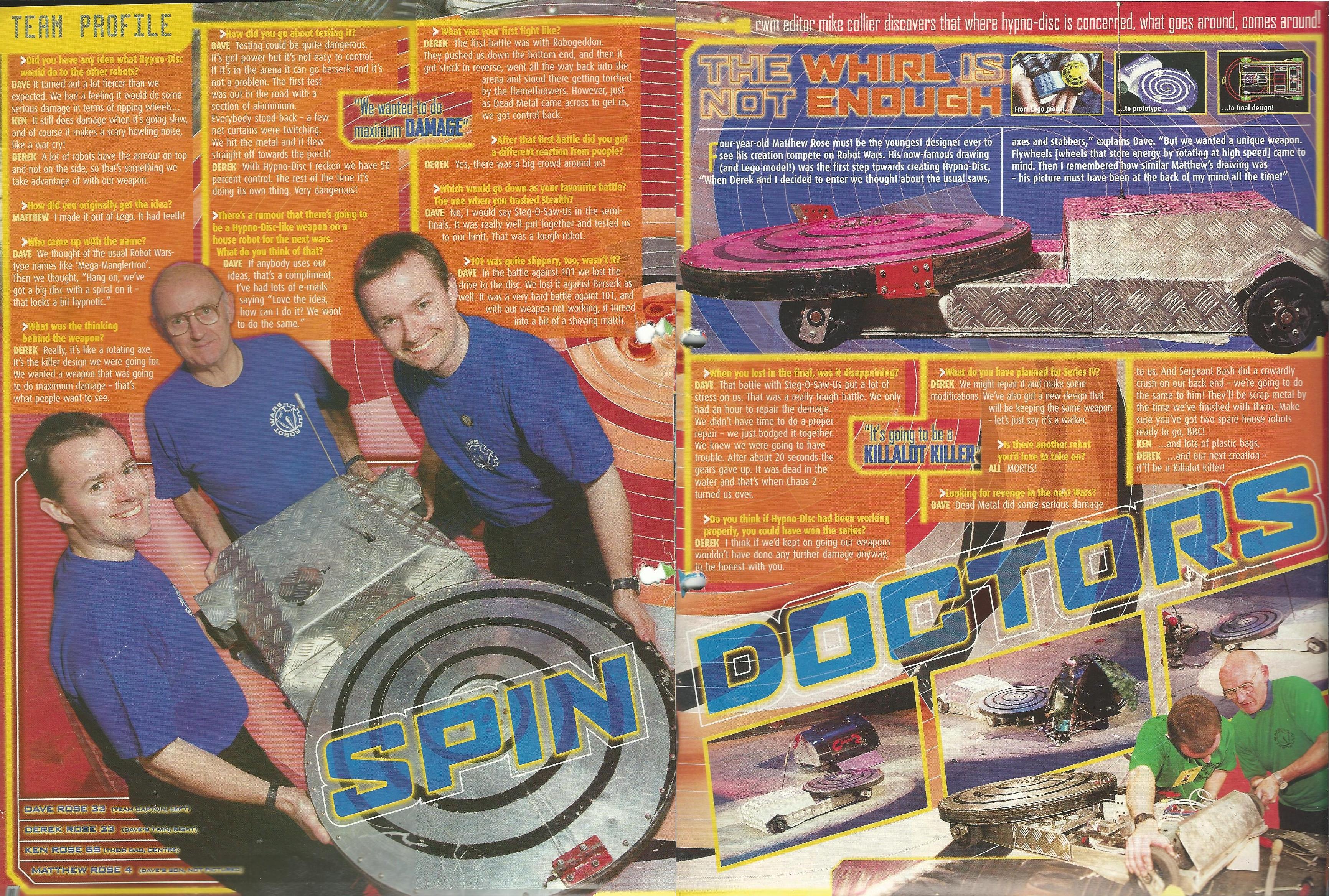 - Uniquely, the Robogeddon team (and the Hypno-Disc team) were interviewed by Craig Charles after their battle; usually this was not done until the second round in Series 3, but it was presumably done due to how remarkable the battle was.