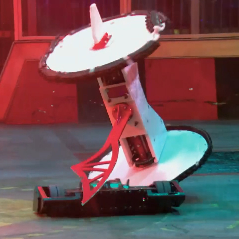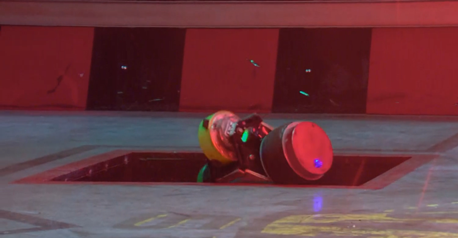 Pulsar started moving again, then stopped, receiving more blows from Gabriel’s sword as it lay immobile, then kicked back into life a third time before the ten-second limit was reached. The two robots continued to exchange blows between each other for the remainder of the battle, with Gabriel’s sword continuing to hammer Pulsar’s body and drum, while Pulsar’s drum tore more sections off of Gabriel’s tyres, sending one piece of tread flying towards an overhead camera.