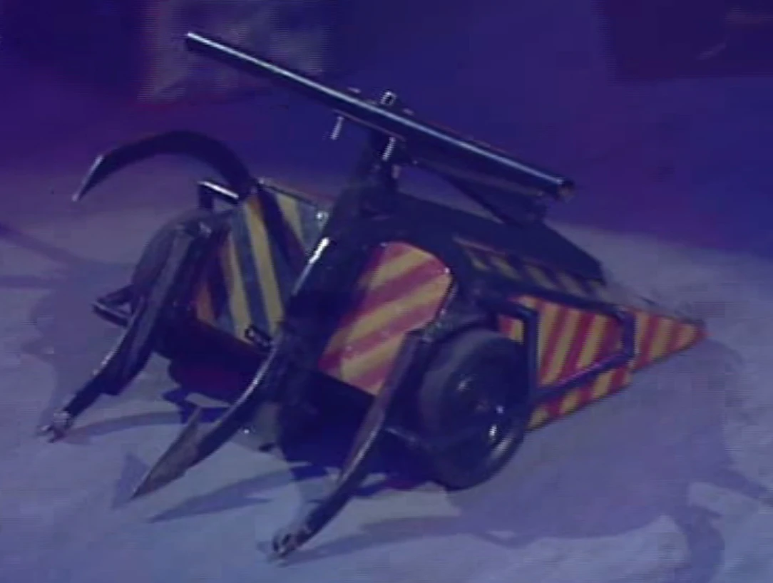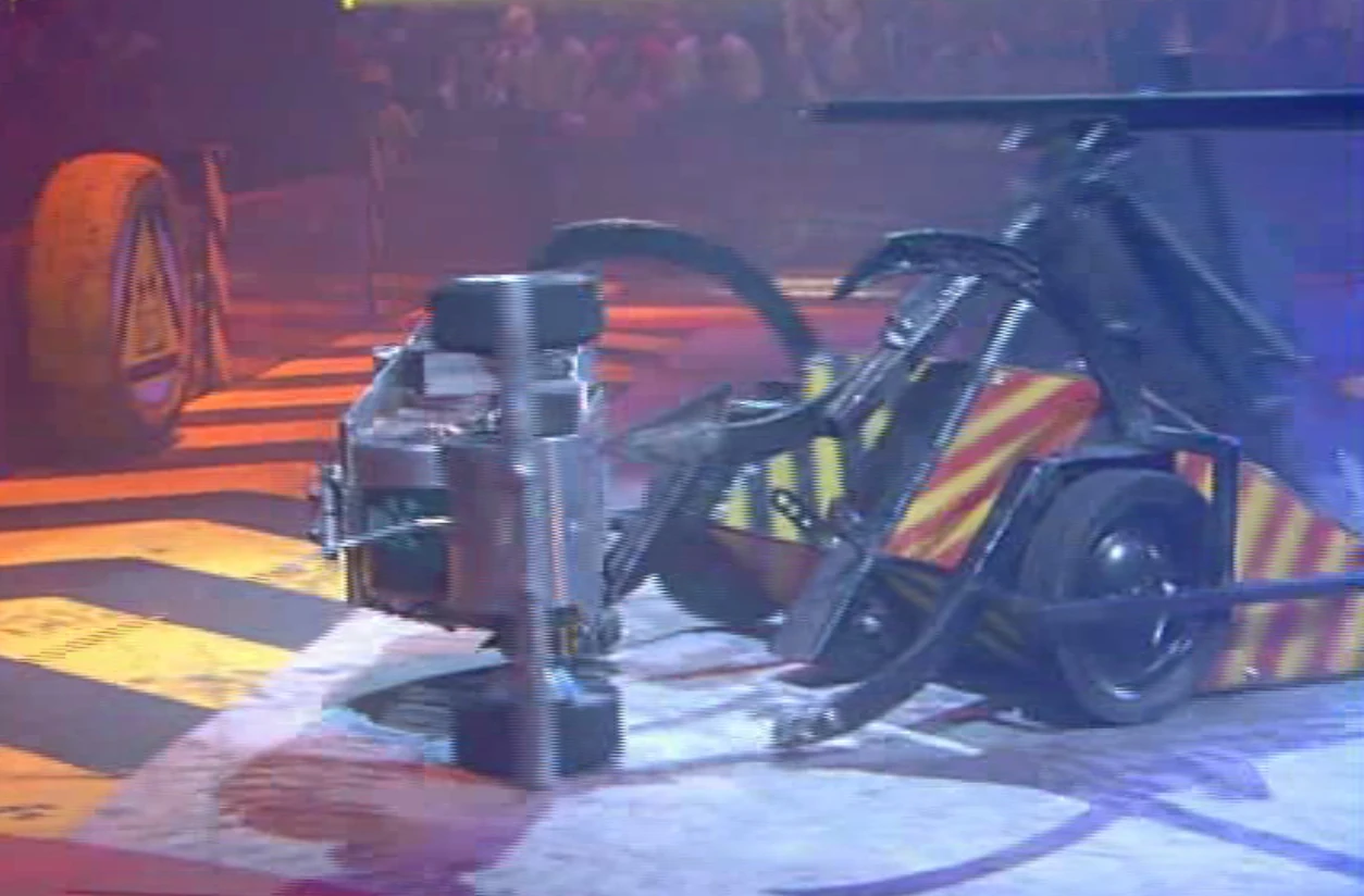 Tetanus started by ramming its opponent, and eventually got its prongs underneath 3 Stegs 2 Heaven. Tetanus pushed 3 Stegs 2 Heaven towards the arena side wall and onto an angle grinder. 3 Stegs 2 Heaven was struggling with manoeuvrability, but as Tetanus lifted it, 3 Stegs 2 Heaven managed to use its spinning blade to snap off one of the claws of Tetanus. Tetanus continued to balance 3 Stegs 2 Heaven on its centre prong until it tried to press down on the eighth seeded robot.