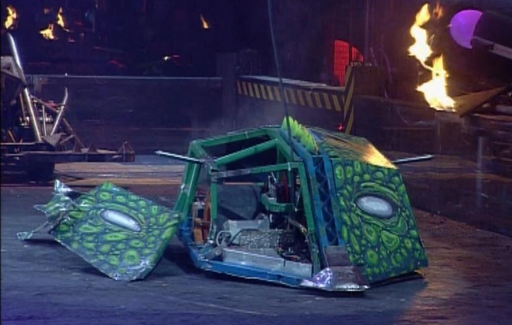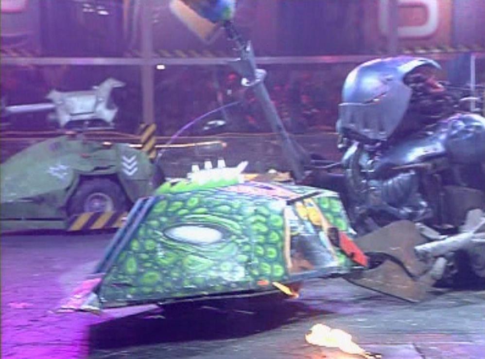 Hypno-Disc then attacked the exposed internals, ripping out V-Max's battery and immobilising it. Shunt was the first robot to attack, but was quickly joined by Killalot and Bash, whilst Dead Metal stuck its pincer inside V-Max.