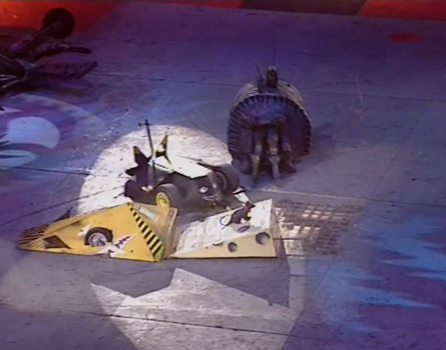 Wharthog turned around again, but Hard Cheese continued with its attacks on the experienced machine. Eventually, the shunts from Hard Cheese rendered Wharthog immobile as well. Hard Cheese proceeded to venture near the PPZ again and bump into Dead Metal, the collision knocking the rat mascot Verminator off its wedge shape. Shunt then placed Verminator over the Flame Pit, before 'cease' was finally called and Hard Cheese declared the inaugural Middleweight Champion.