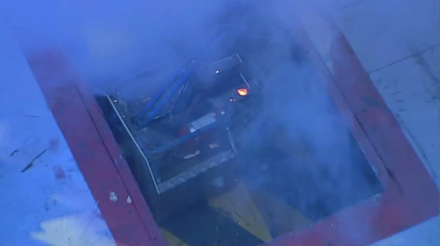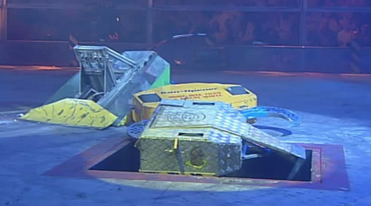 While the other three robots clashed, Refbot looked at EWE2, and began to count it out, as Kan-Opener opened the Pit. The suddenly, Kan-Opener shoved Raging Knightmare over the descending Pit, but it didn't fall in because it was caught on one of Kan-Opener's arms. Refbot reached 10, EWE2 was whacked by Matilda's flywheel, while the lucky survivor Raging Knightmare finally fell in the Pit, and cease was called.