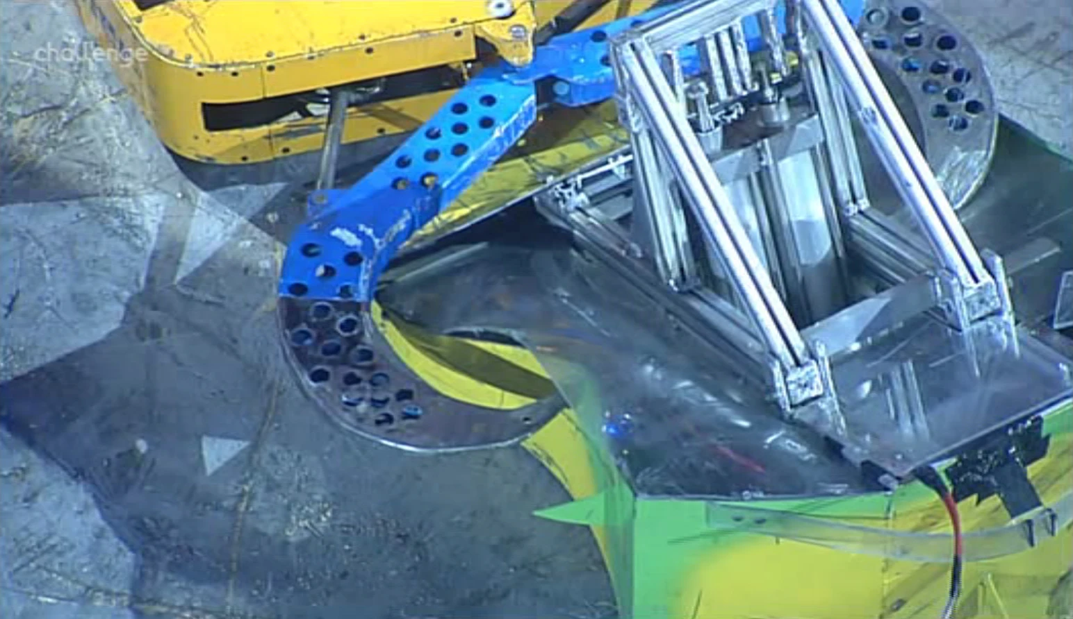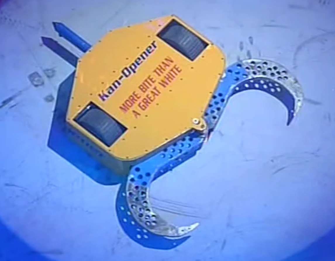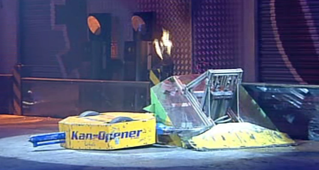 Kan-Opener then charged Raging Knightmare into the CPZ and was flipped twice by the previous Annihilator runner-up. The second flip caught Kan-Opener on the arena side wall and it was stuck there. Ripper then came in and flipped Raging Knightmare so it too was stuck on the arena side wall. Raging Knightmare fell off the wall, but got stuck upside down. Dead Metal came in, and Ripper attempted to flip it too, but it was too heavy. Ripper then flipped Kan-Opener so that it nearly went out of the arena, but instead came back down and landed on Dead Metal. Dead Metal attacked Ripper, causing sparks to fly, but both it and Kan-Opener escaped and resumed their fight in the centre of the arena.