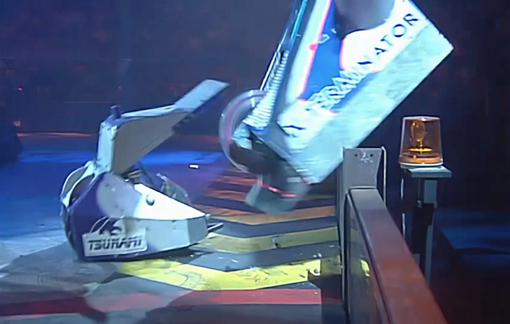 Tsunami was turned over a third time, but did not have enough CO2 left to self-right. X-Terminator attacked again and sent a cloud of smoke flying from Tsunami, and the final attack sent Tsunami flying over the arena wall.