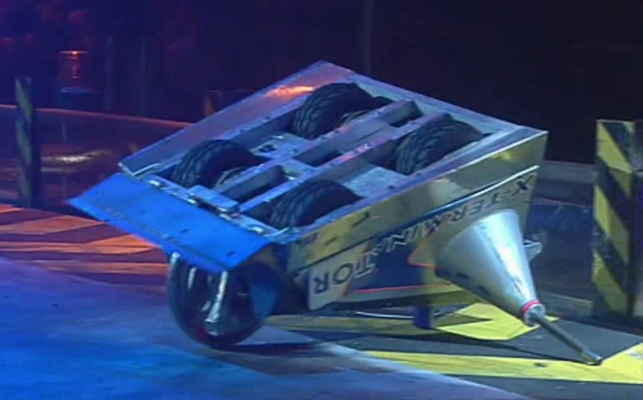 Despite X-Terminator being unable to self-right, Tsunami attempted to flip it out of the arena but was twice unsuccessful, which resulted in X-Terminator getting back onto its wheels. From then on, X-Terminator showed no mercy and launched a number of attacks on Tsunami with its spinning disc, twice rolling it over but Tsunami was able to self-right.