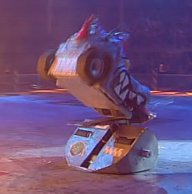 Kat 3 missed an axe blow, and Bulldog Breed flipped it over. Kat 3 tried to self-right, but Bulldog Breed pushed it onto its wheels. Kat 3 then activated the Pit. Kat 3 and Bulldog Breed both missed their attacks, before Bulldog Breed flipped Kat 3 into Killalot, who shunted it into the arena centre. The angle it sat on made it unable to self-right. Bulldog Breed then threw Kat 3 over Sir Killalot and onto its wheels.
