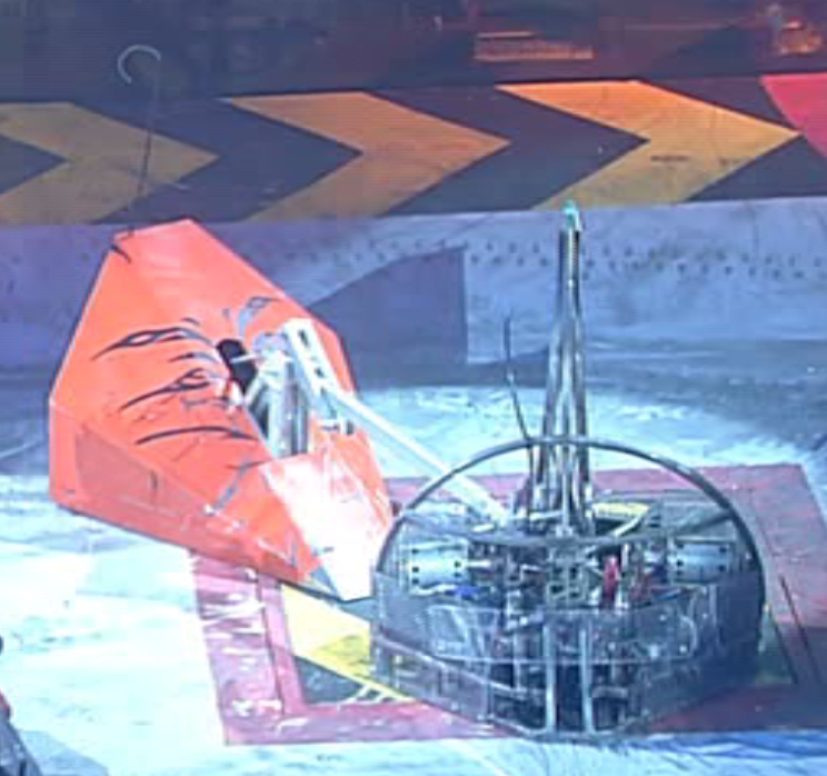 More pushing and shoving ensued, and Velocirippa released the Pit. Hard reversed into T-Wrecks, almost pitting it, but the toothed spinner fled again. Kat 3 continued to attack, but the axe point had come off, rendering the weapon useless.