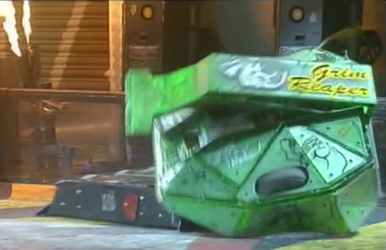 On a separate charge, Storm 2 slammed The Grim Reaper into the angle grinder it utilised at the start of the battle, knocking the top plating off of the angle grinder itself. Storm 2 pushed The Grim Reaper around in a circle, and then into an arena wall. Sgt. Bash spat flames at The Grim Reaper, with Storm 2 preventing The Grim Reaper from escaping as Sgt. Bash clamped The Grim Reaper with its claw. Sgt. Bash crumpled the frame of The Grim Reaper before it escaped.