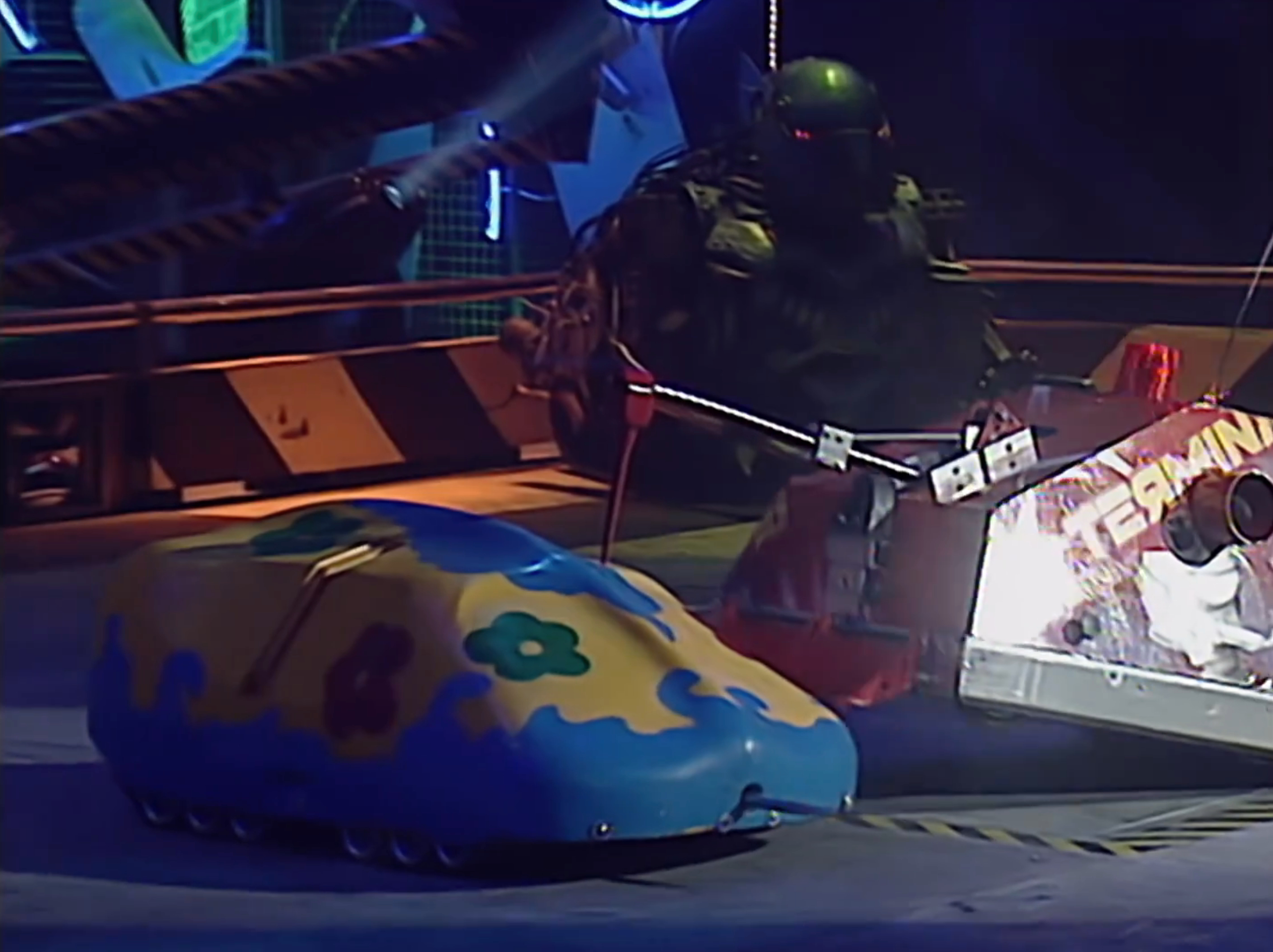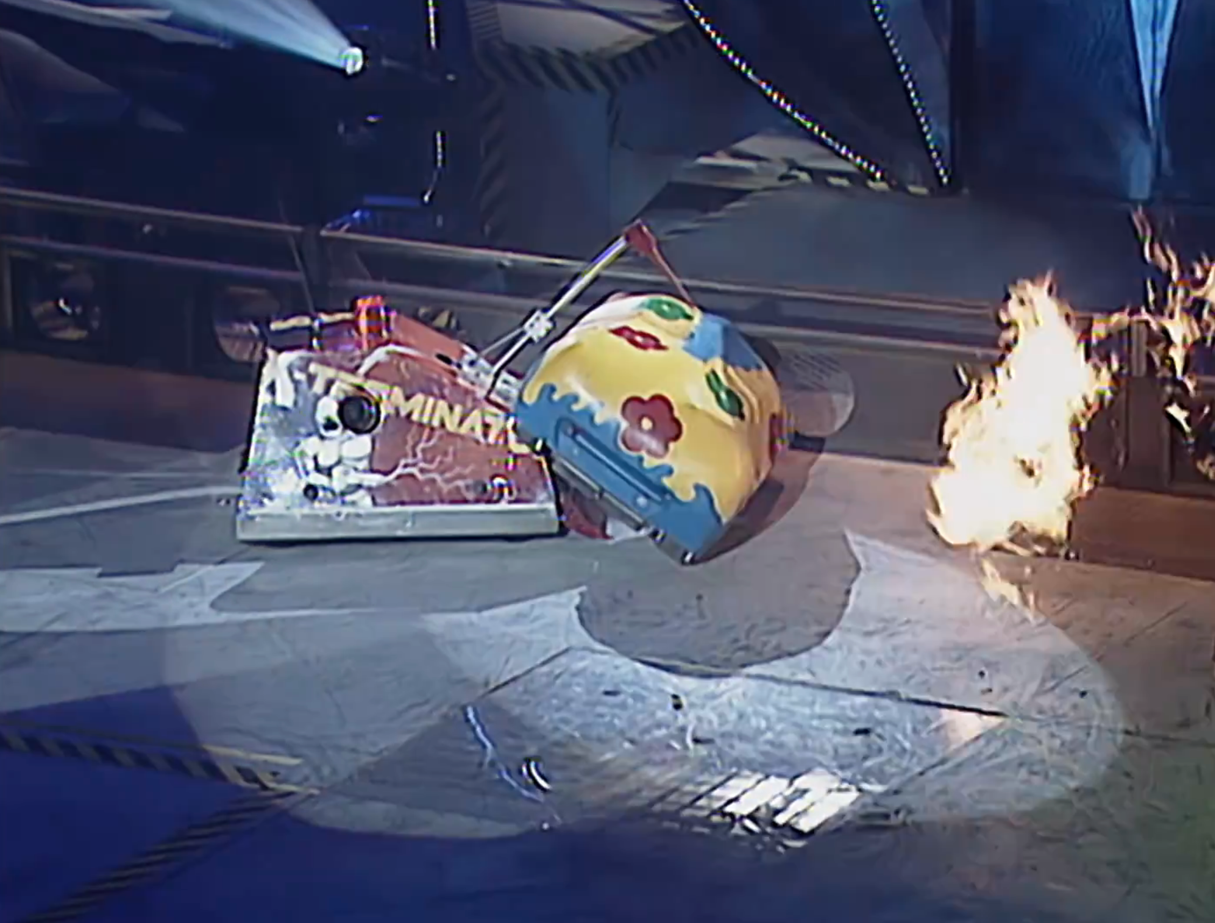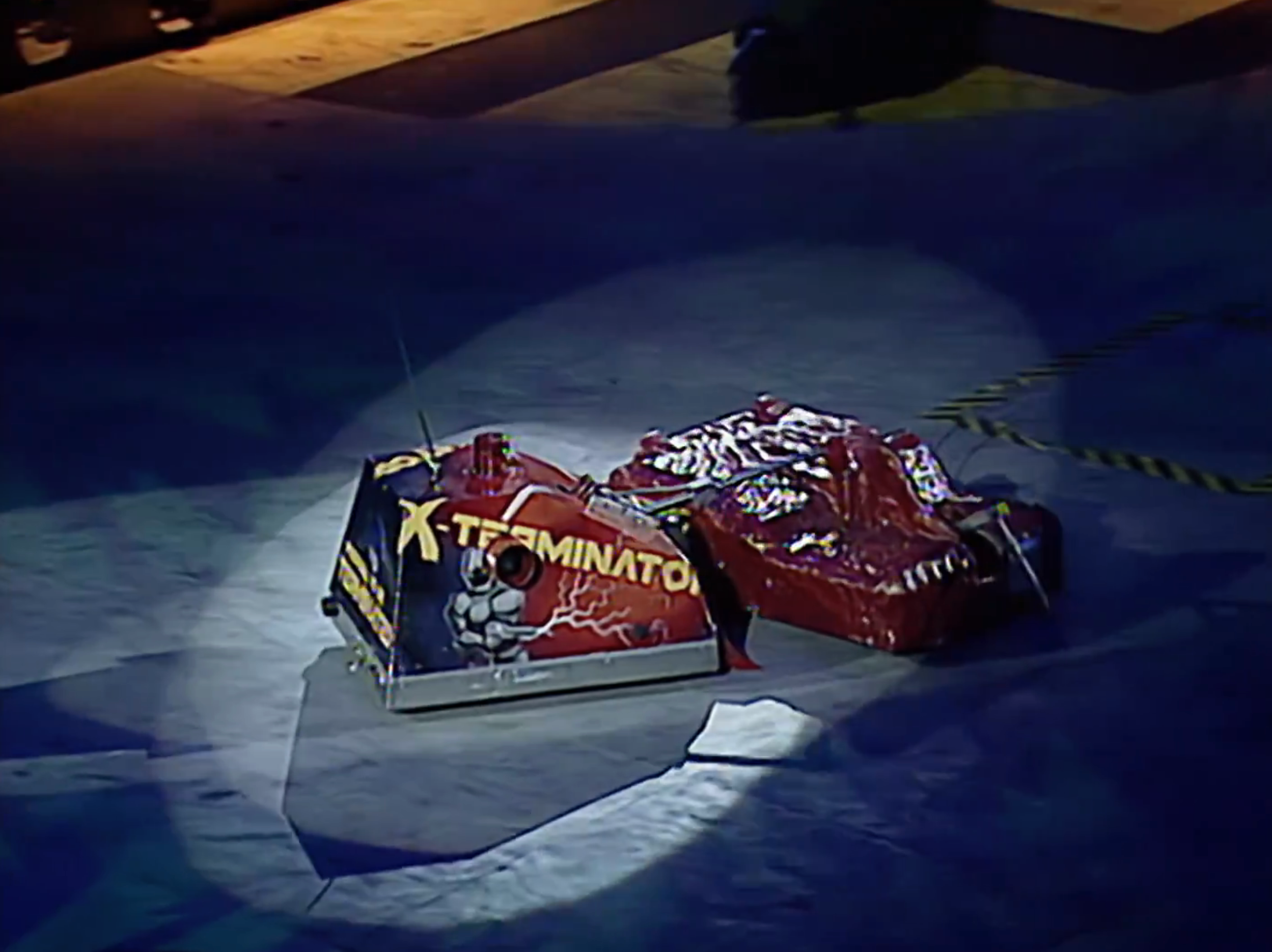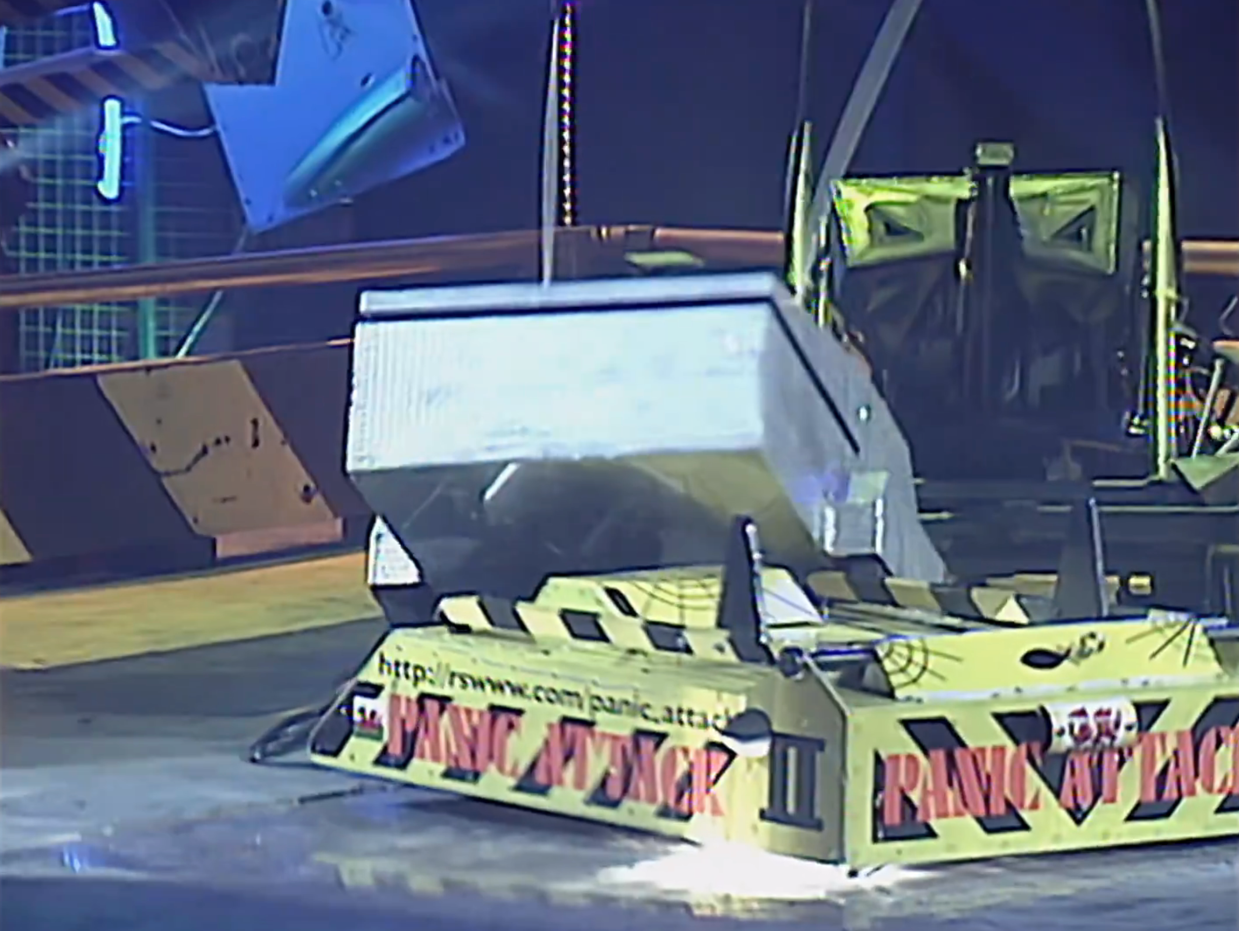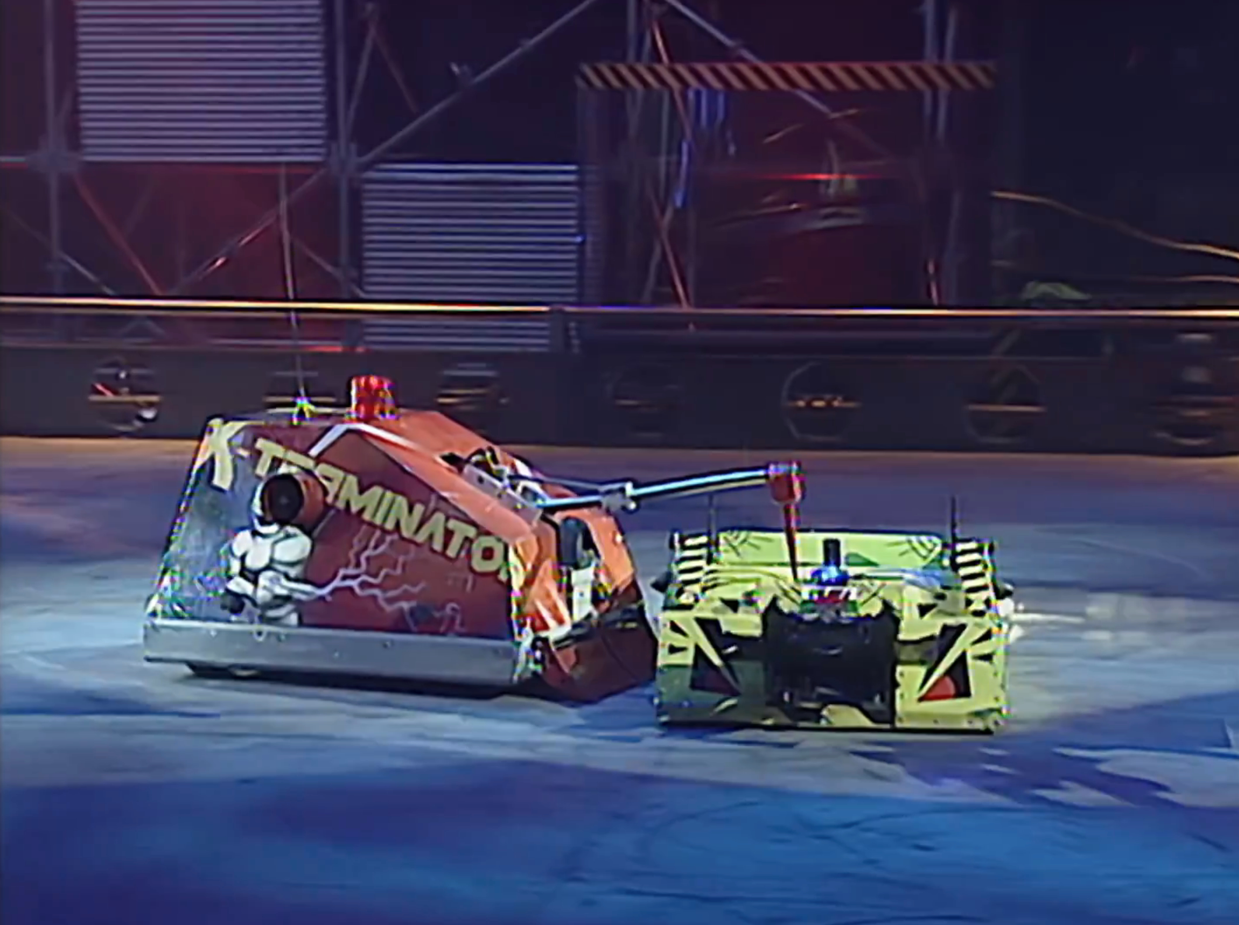 X-Terminator started quickly again, zipping across the arena floor and into the arena wall once more. The two met side on with X-Terminator missing with its spike. X-Terminator then came onto the attack again, sliding under the side of Panic Attack and pricking it with the spike. X-Terminator continued to attack Panic Attack, axing the front of its opponent. Panic Attack attempted to weather the attacks, reversing into X-Terminator, but X-Terminator came onto the attack once more, catching the side of Panic Attack. Panic Attack spun on the spot and X-Terminator attempted to spike the back of Panic Attack, but missed. X-Terminator continued to attack, though, and once again got under the side of Panic Attack, axing the top of it. X-Terminator then drove Panic Attack around the arena, but struggled to angle it into a hazard, so slammed it into the arena wall twice.