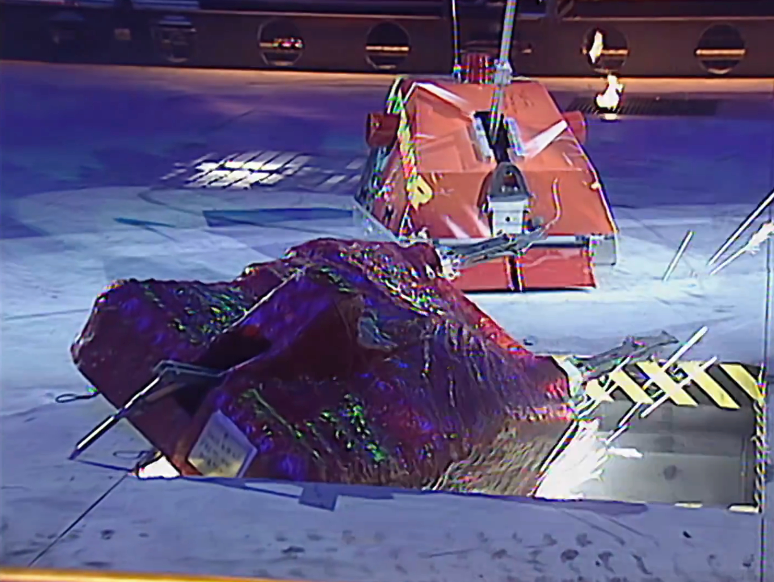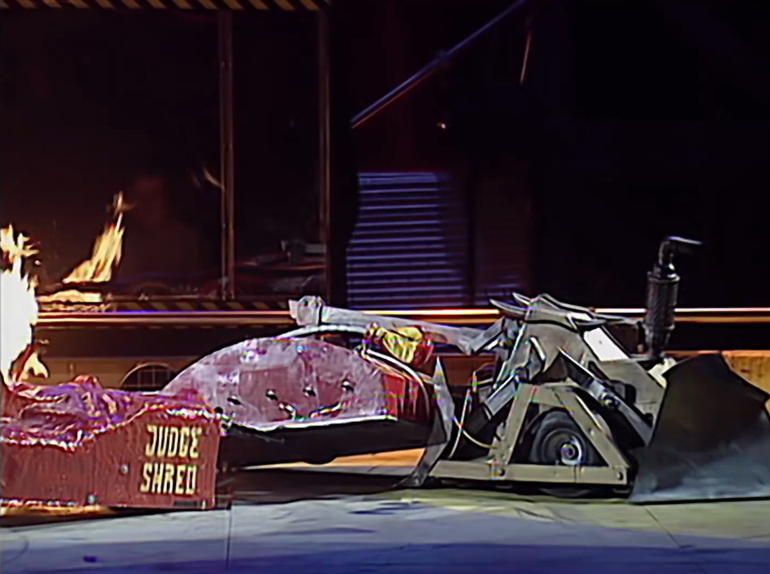 Judge Shred repeatedly attempted to hoist itself out of the Pit with its arms, which gripped onto the lip of the Pit, but couldn't get away, so Matilda came in and used its chainsaw on the top of Judge Shred.