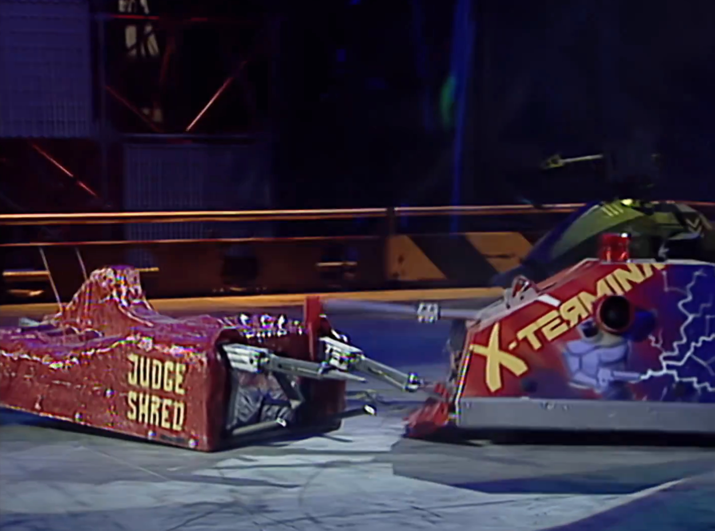 X-Terminator accelerated across the arena floor and crashed into the arena wall, before quickly adjusting itself and attacking Judge Shred's rear with its spike weapon. Judge Shred lifted its claws up, but not with X-Terminator on top of them. Judge Shred then pinched the front X-Terminator, before its opponent ran at the side of Judge Shred, which allowed it to carry it towards the Pit. X-Terminator initially struggled to loosen itself from Judge Shred, but the two separated and Judge Shred dropped into the Pit.