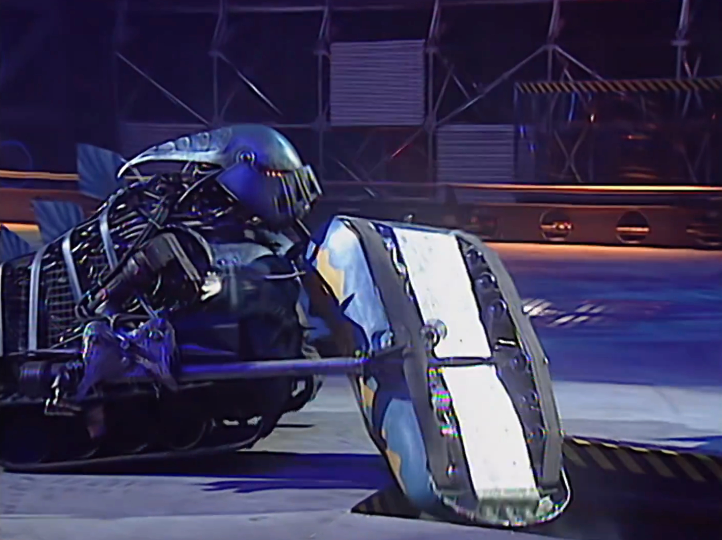 Mr Punch struggled to get away from the arena wall, flicking away with its arm. Judge Shred trundled towards Mr Punch and slid under the side of its opponent with its lifting claws, before backing away. Judge Shred came onto the attack again, nudging into the side of Mr Punch and then lifting it once more.
