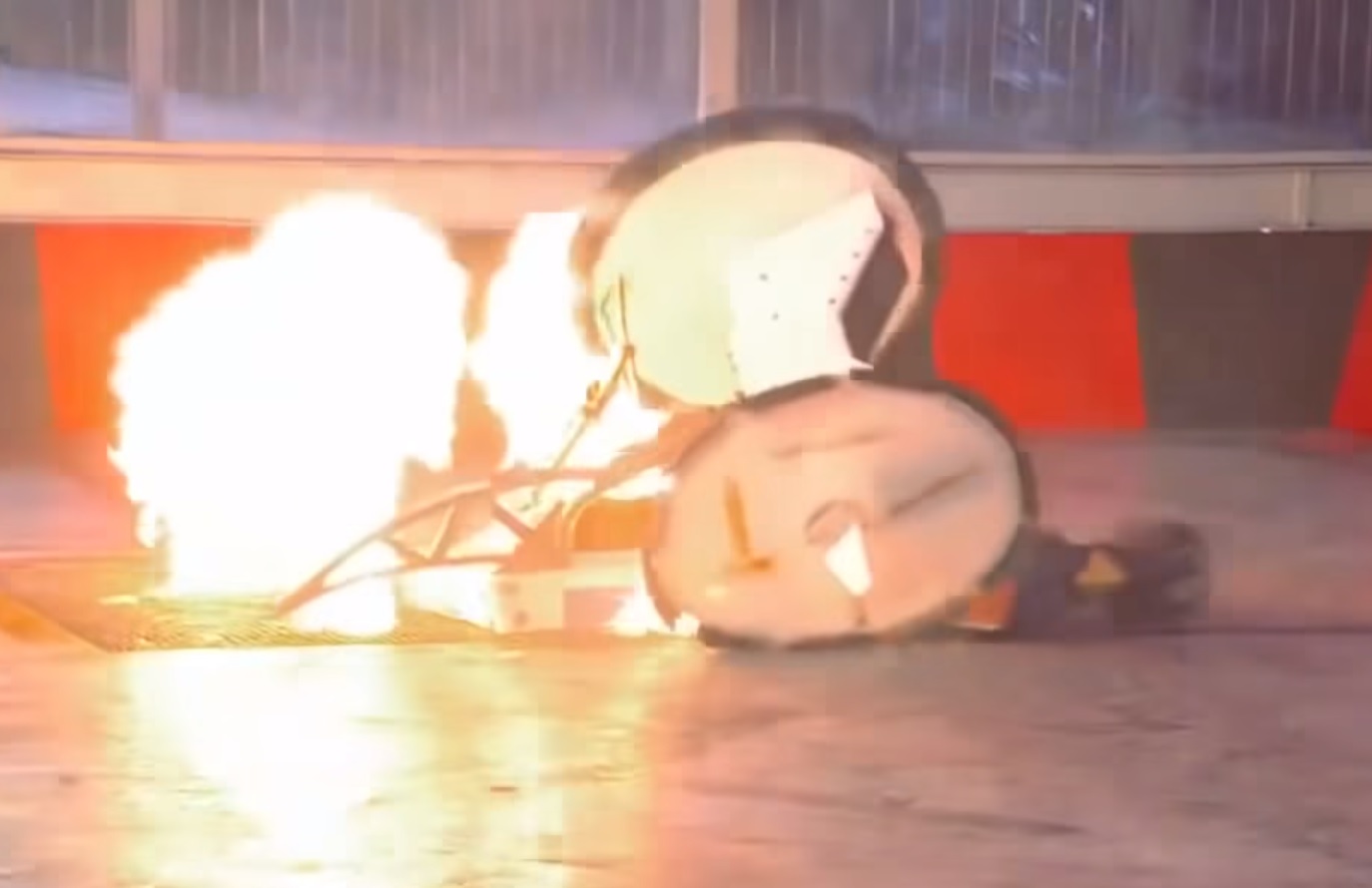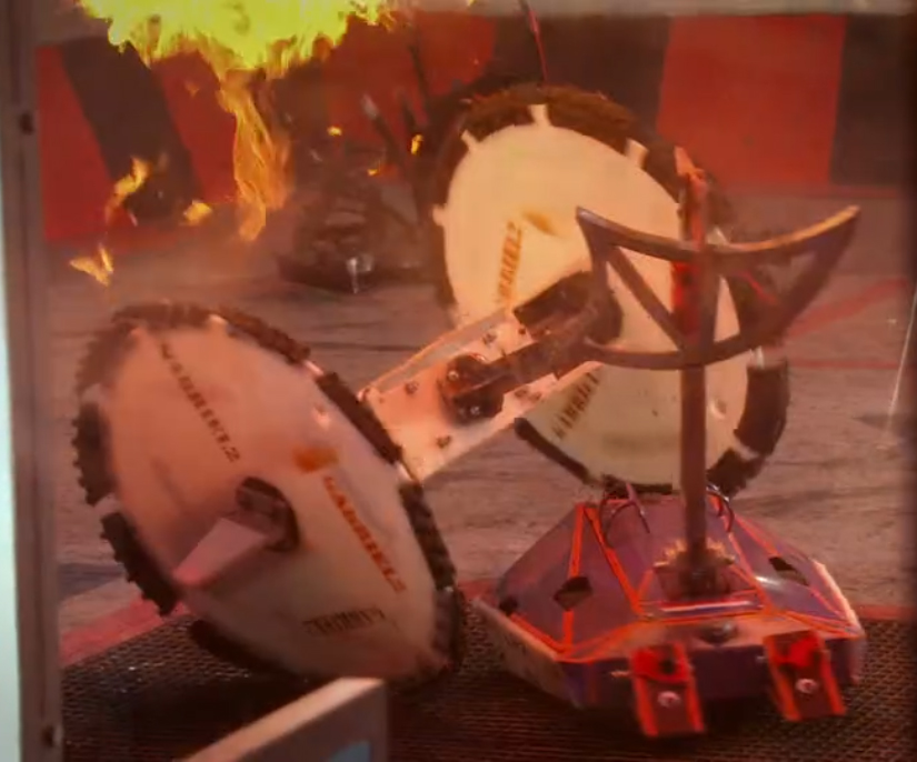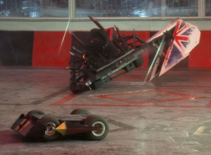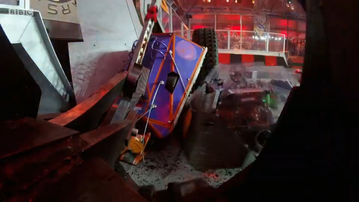 The burning Diotoir drove towards Apollo to try and attack with the flywheel, but Apollo's low front stopped it reaching. Apollo pushed Diotoir back into Sir Killalot, who tried grabbing but failed. Diotoir escaped and drove at Apollo, but the UK captain turned and flipped Diotoir into the air, where it crashed down. Diotoir recovered, but drove onto the flipper of Apollo, where it was thrown up again, landing on the flywheel. Apollo wedged under Diotoir again and trapped it on its side.