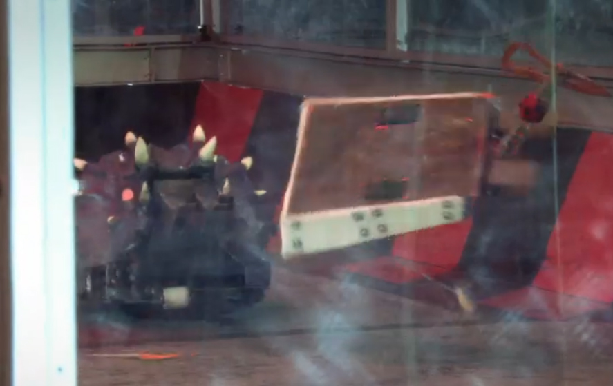Rabid M8 spun on the spot, clipping Gabriel 2 on the wheel, as the other wheel appeared to stop working. Gabriel 2 started moving intermittently, so Rabid M8 ran to press the Dial of Doom, which allowed Shunt to shove Gabriel 2 into a side wall. Shunt released Gabriel 2 to allow it to escape the CPZ, but its hampered movement stopped it doing so, meaning Shunt attacked again. Rabid M8 punched the damaged Gabriel 2 a few more times before Gabriel 2 stopped completely just before 'Cease' was called.
