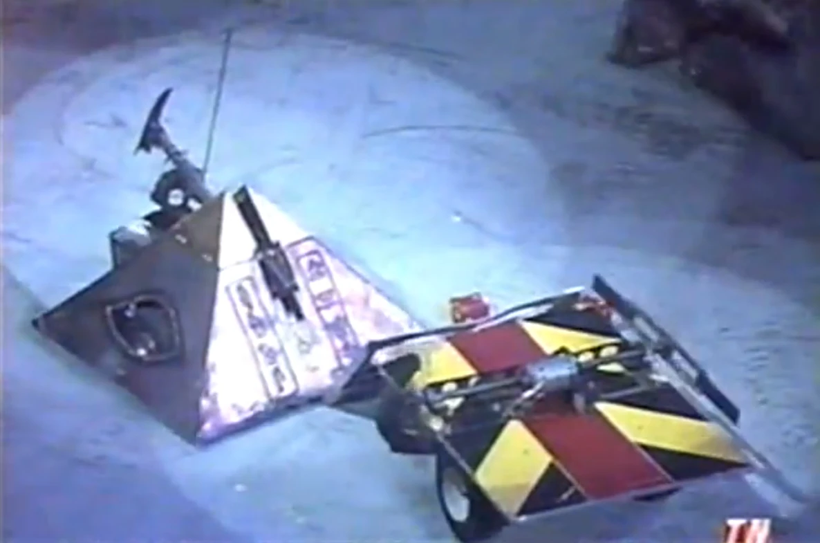 These attacks continued as Refbot separated Run Away from Lightning Tracks, leaving both of Run Away's rear wheels off-camber and the drive system incapacitated. However, Lightning Tracks was deemed to have been immobilized first, so was counted out and thrown over the top of Run Away by the Floor Flipper before being pitted by Shunt.
