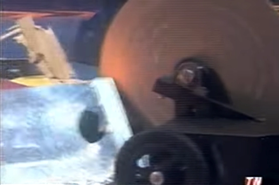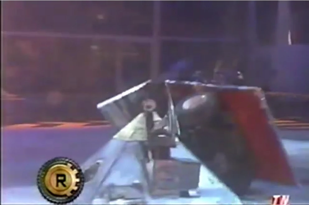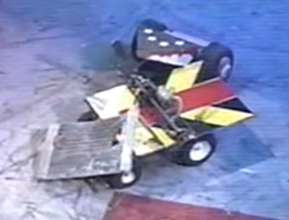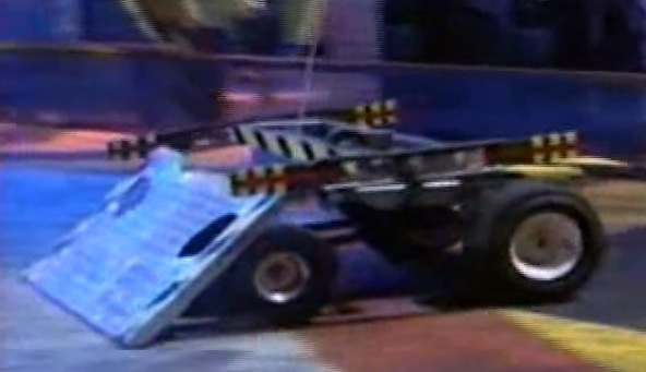 Immediately, Run Away darted off to press the Pit trigger, which Mark Joerger would later explain was part of a plan to push General Chompsalot 2 down in the early stages. However, this allowed General Chompsalot 2 to pursue, ram and lift it off the arena floor with its jaws. Though Run Away inflicted light damage with its blades in return, the rear axle flexed, causing the drive chain to come loose once again.[5] General Chompsalot 2 proceeded to carry, tip and twice ram Run Away against the wall; left on its side and again unable to self-right, Run Away was counted out and set upon by Dead Metal and Sgt. Bash.