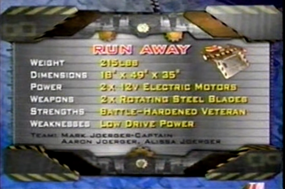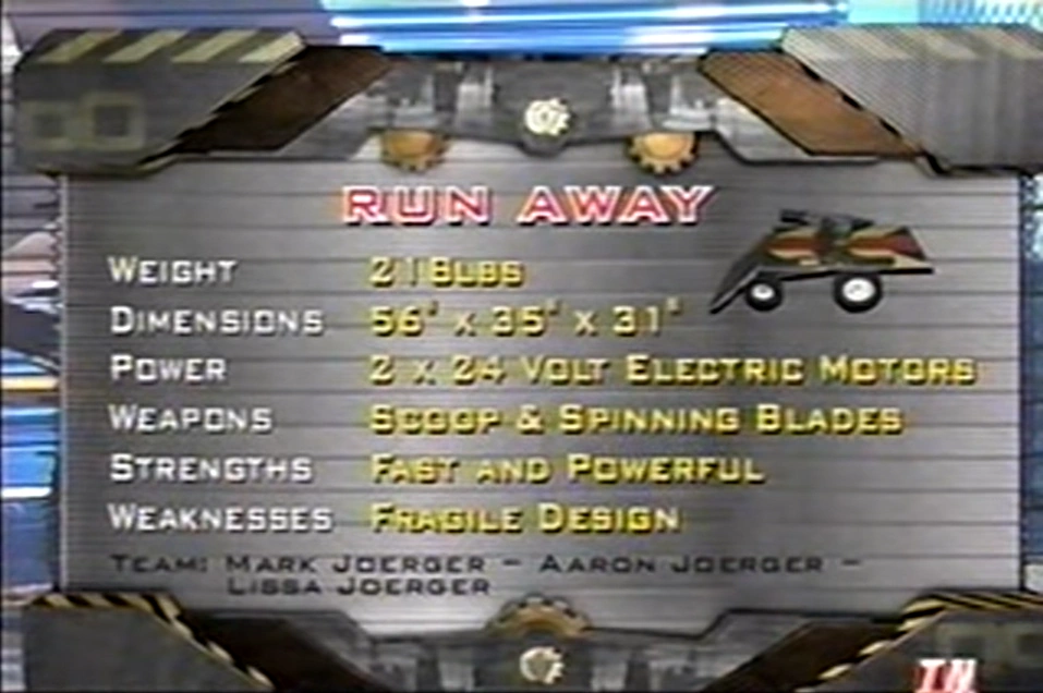 Additionally, Team Jawbreaker captain Tim Berghoefer cited Run Away's wedge as a complement to his machine's jaws. Joerger, however, admitted that he needed to 'back up' and give himself plenty of space in order for Run Away to take advantage of its top speed for ramming attacks.