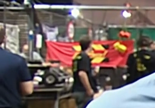 Nearby, Sir Killalot had left his CPZ and lingered around the bottom-left corner of the arena. Without warning, and in a repeat of earlier House Robot transgressions from the same stage of the competition, Run Away was caught, lifted and turned over by Sir Killalot's claw. Sir Killalot then attempted to dump Run Away out of the arena, with Dead Metal also attacking, but settled with carrying the damaged Team Run Amok machine over to the Flame Pit[8] and Floor Flipper. Run Away was thrown into a somersault and back onto its wheels, but lost mobility after its drive chain came lose again[11]; the removable link had also been ejected.[8]