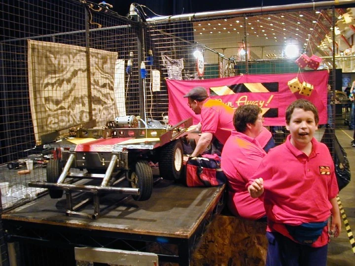 Needless to say, Run Away lost the heat to Panzer Mk2 and was eliminated from the US Championship. However, in anticipation of further appearances, the damage inflicted to it was repaired, the chain reattached and multiple adjustments made to the wedge, drive and weapon systems. Among the latter was the replacement of the weapon motor (as originally used in Robotica) with a spare brought along by Mark Joerger. Joerger himself received further assistance from friend Dan Danknick – present as part of the Robot Wars technical crew - and Mike Morrow of Team JuggerBot, who helped supply a new tube to repair a punctured rear tire.[8]