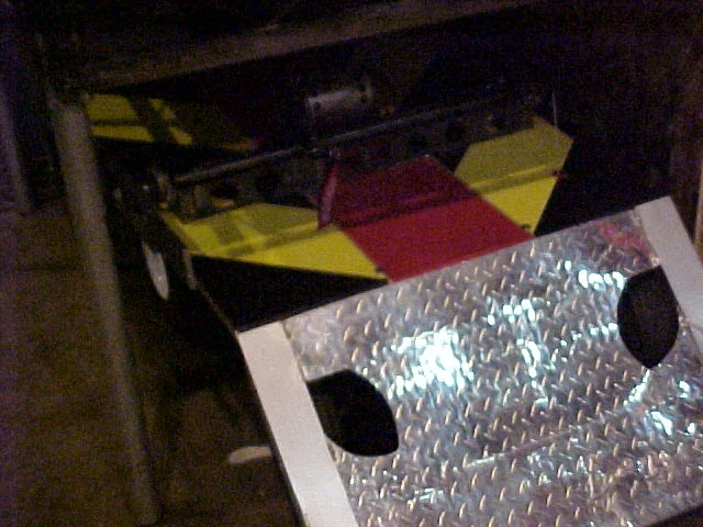 Other features of Run Amok include a welded steel chassis, pneumatic tires, 3/4-inch thick plywood top armor and a checker plate front wedge. To ensure that the front tires had enough clearance with full steering lock, two holes were cut in to either side of the wedge which were also frequently interpreted as the robot's 'eyes'.[4]