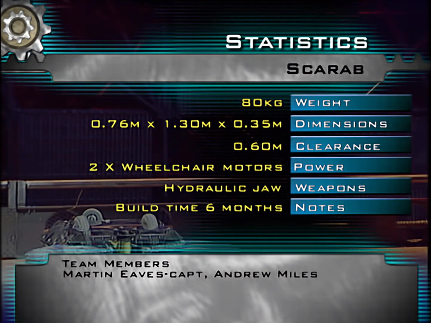 Scarab was an invertible, two-wheeled robot with a roughly diamond shaped tubular steel body, transparent armour and a set of hydraulic crushing jaws which could crush at 2.5 tonnes of pressure. It was the first competitor to use a horizontal crusher, a weapon type which would eventually be used effectively by future competitors Kan-Opener and Tough as Nails in later series. Like many robots of it time, Scarab was powered by wheelchair motors, and had strong armour, but it was slow at 8 mph, had a high ground clearance, and its tyres were vulnerable to damage from the Arena Spikes.